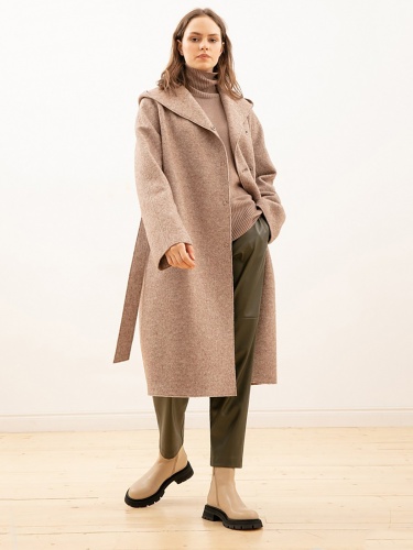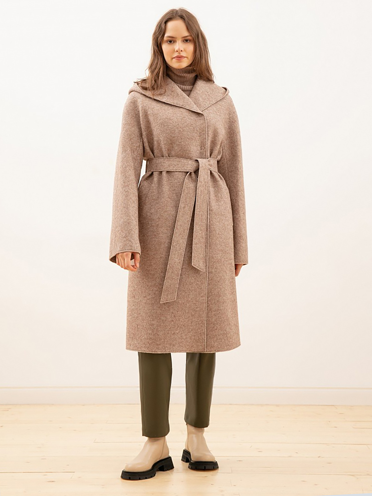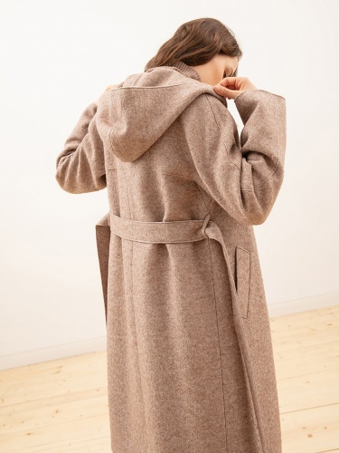 Пальто-халат с объемным капюшоном. Базовый коричневый оттенок, свободный крой подходит для любого типа фигуры. Застежка на пуговицы, в комплекте идет пояс из основного материала изделия. Шерсть в составе делает материал мягким, приятным на ощупь и хорошо сохраняющим тепло.