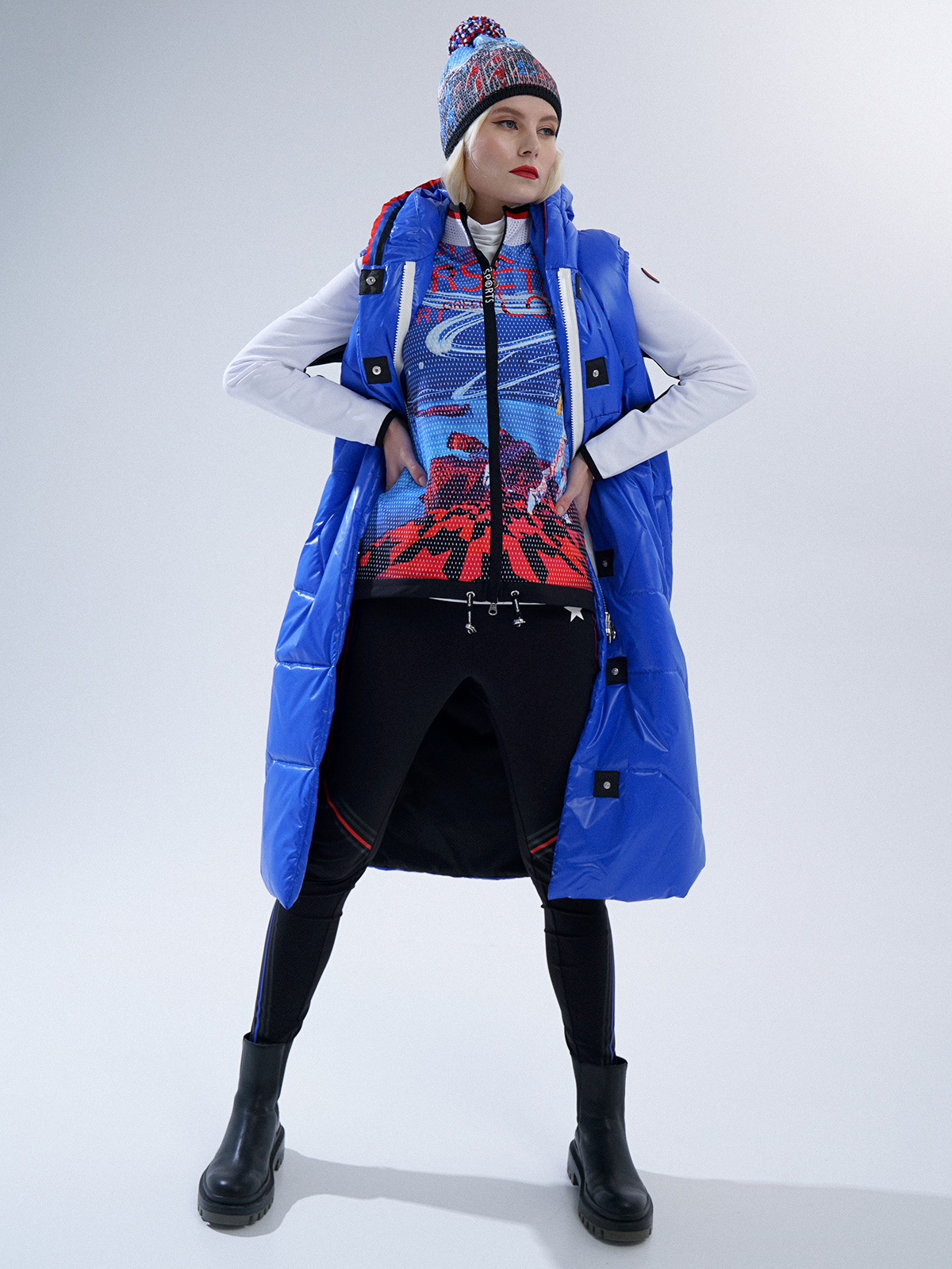 Удлиненный стеганый жилет ярко-синего цвета – теплый и стильный элемент аутфита. Подойдет для образов в спортивном или повседневном стиле, а также для образов спорт-шик. Застежка на контрастную молнию и клепки. Объемный капюшон защищает от ветра.