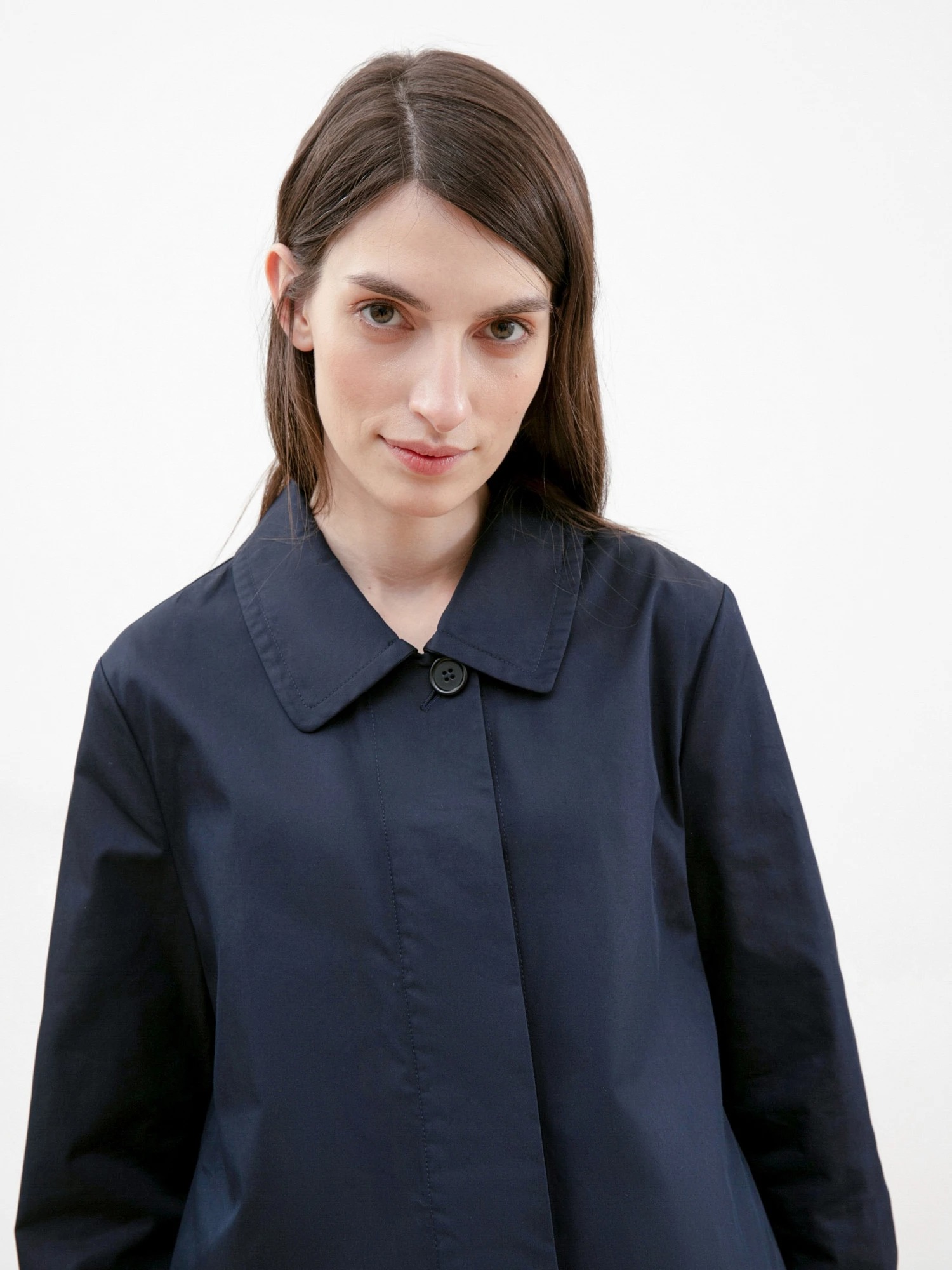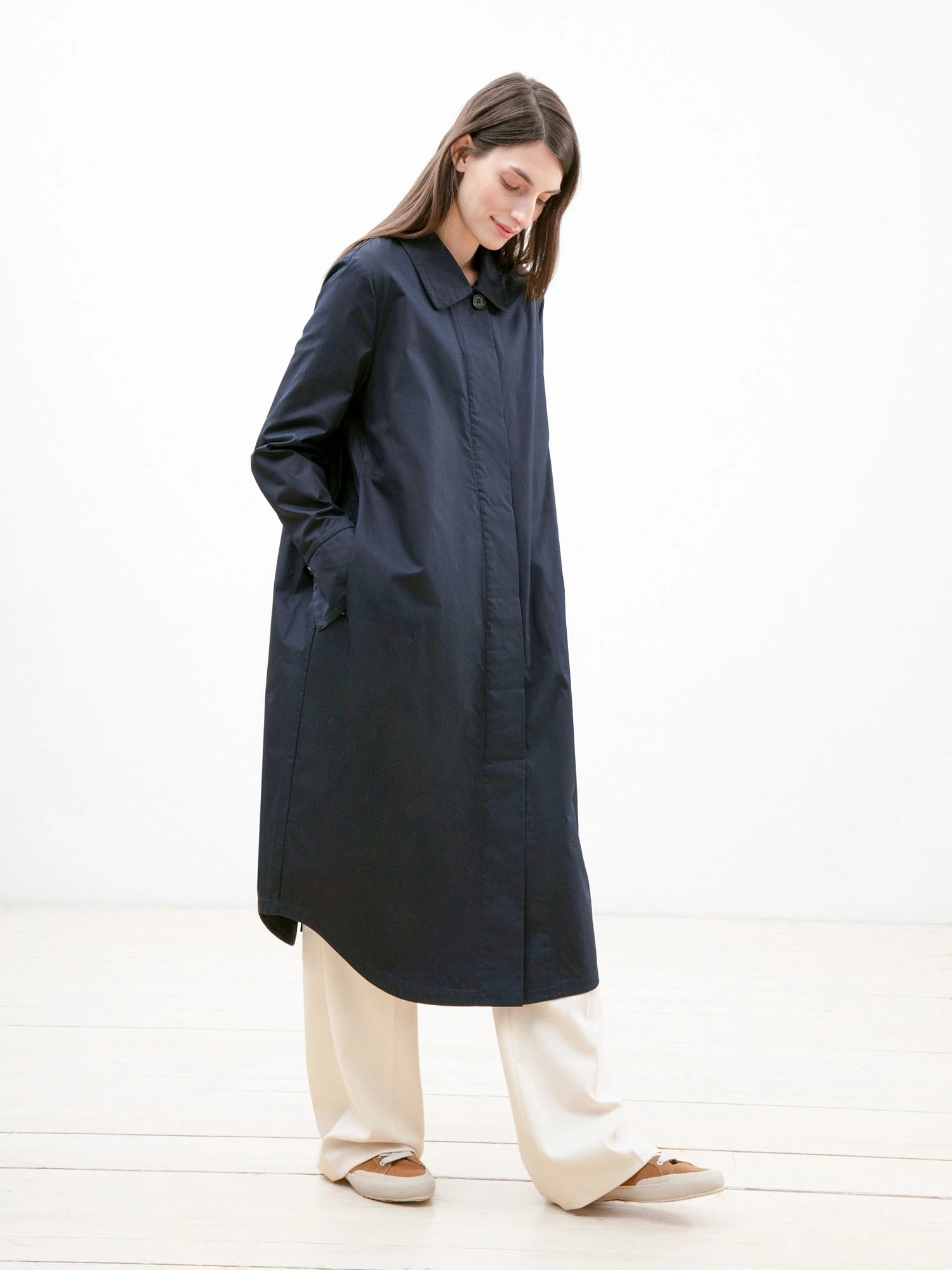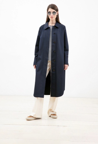 Плащ прямого силуэта из непромокаемой ткани темно-синего цвета. Аккуратный отложной воротник, классический втачной рукав. Низ рукава обработан широкой манжетой с застежкой на пуговицу. Изнаночная сторона манжеты имеет контрастную обработку для возможности отворота. Застежка супатная на ряд крупных пуговиц и одну роговую пуговицу для фиксации воротника. Длина плаща ниже колена, фигурный низ.