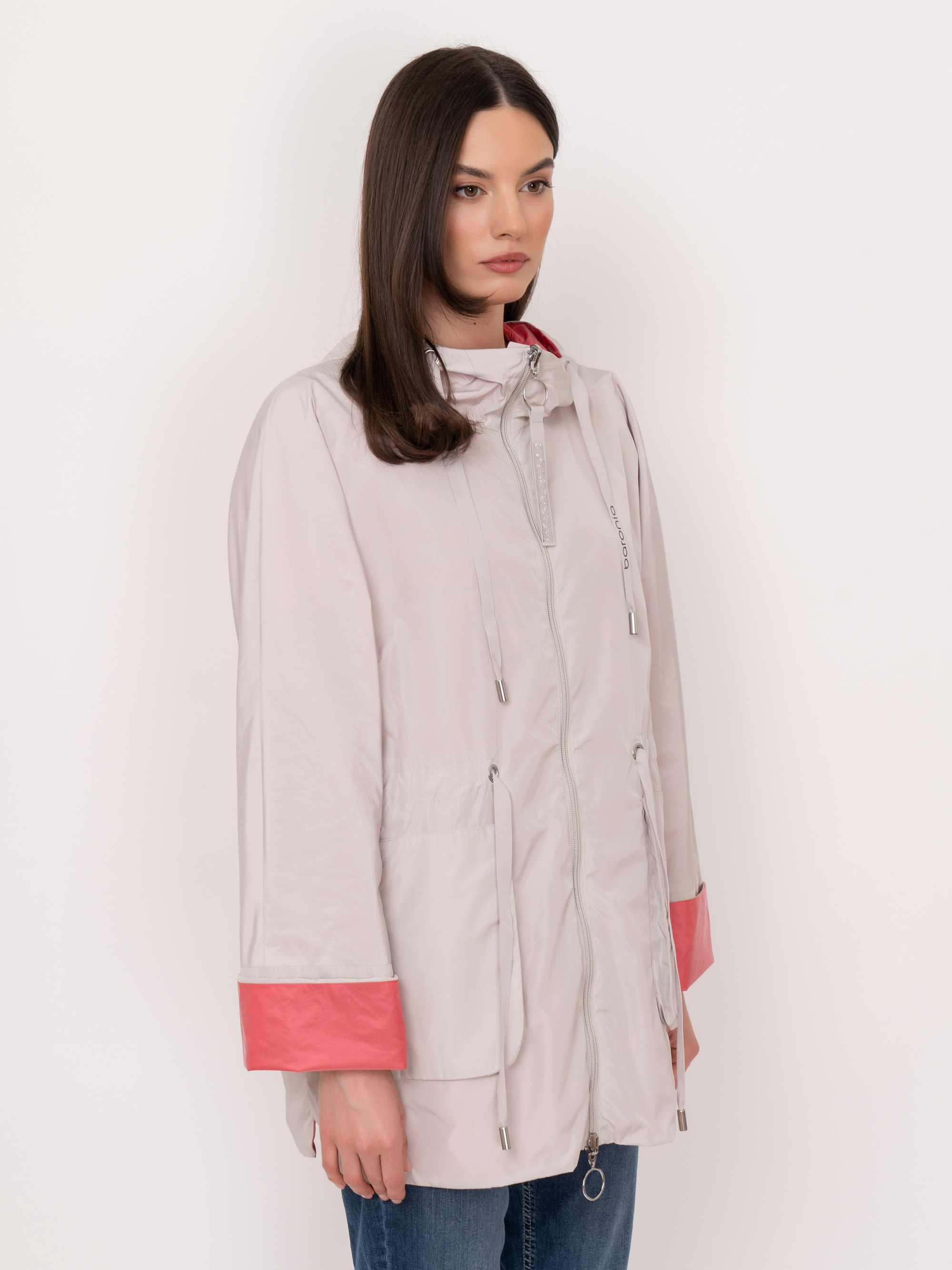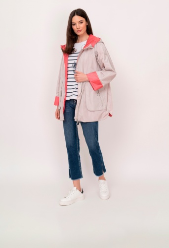 На сайте указаны российские размеры. Легкая двусторонняя куртка розового цвета, которую можно носить с обеих сторон. 2 боковых кармана на молнии. Регулировка талии кулиской. Рост модели: 175 см. Длина куртки: 76 см.