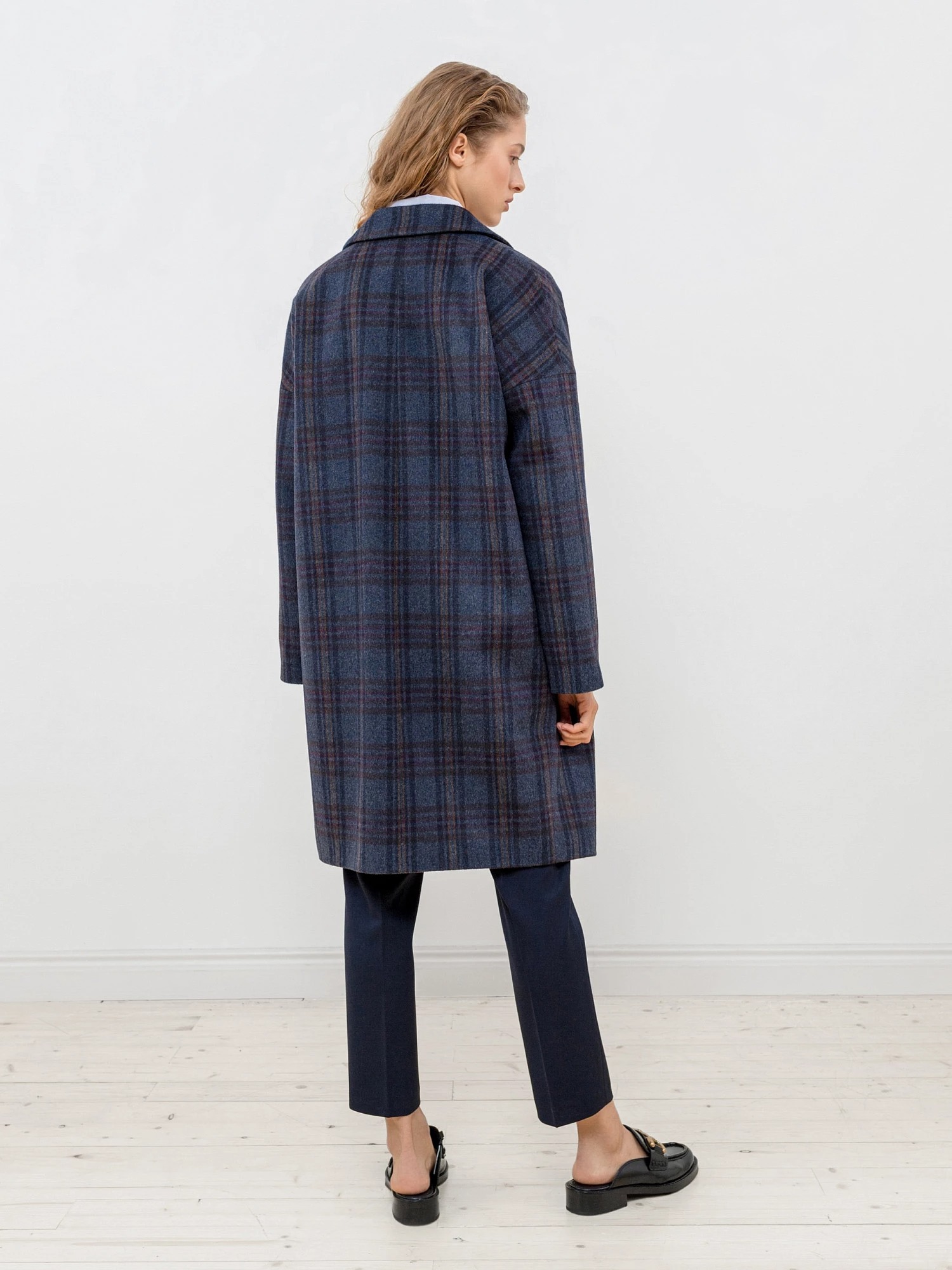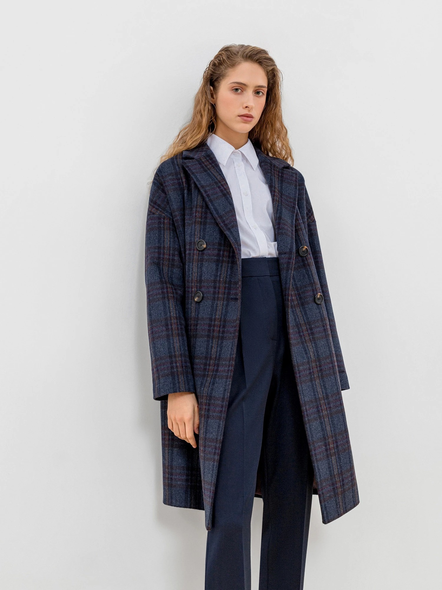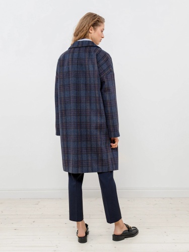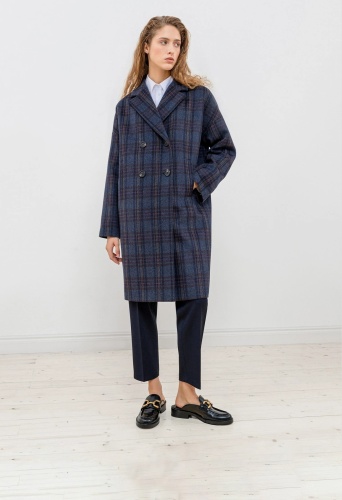 На сайте указаны российские размеры. Двубортное пальто с характерным "О" силуэтом - универсальная вещь для любого гардероба. Рубашечный рукав со спущенной линией плеча создает дополнительный комфорт, что дает возможность носить под пальто такие вещи, как жакеты и при этом не затрудняет движение. Пальто имеет два глубоких и функциональных кармана с листочками, два ряда крупных пуговиц под натуральный рог и классический английский воротник. Длина пальто до колена, что позволяет сочетать его с юбками и брюками разной длины. Пальто выполнено из премиальной шерстяной ткани в синюю клетку.