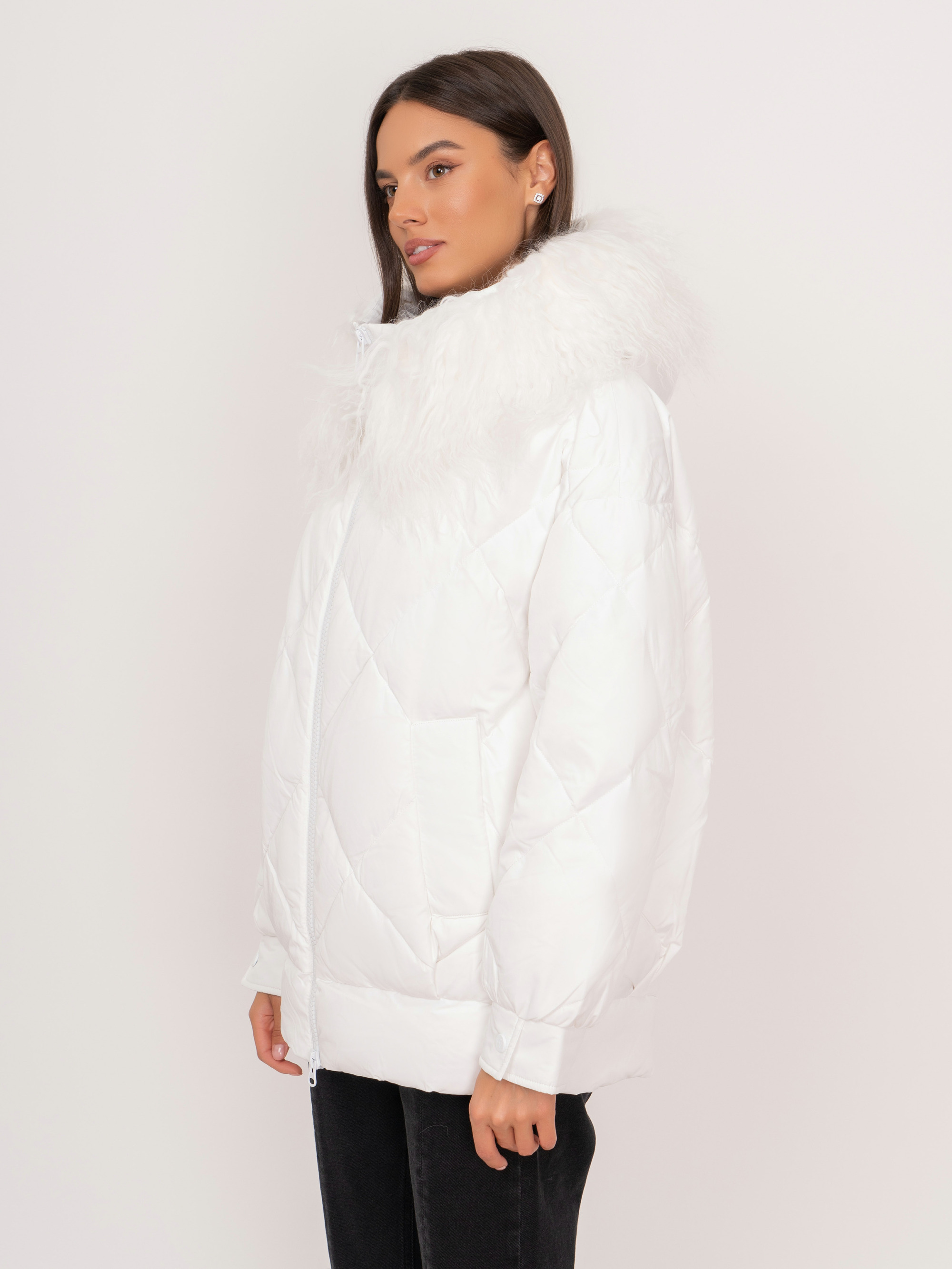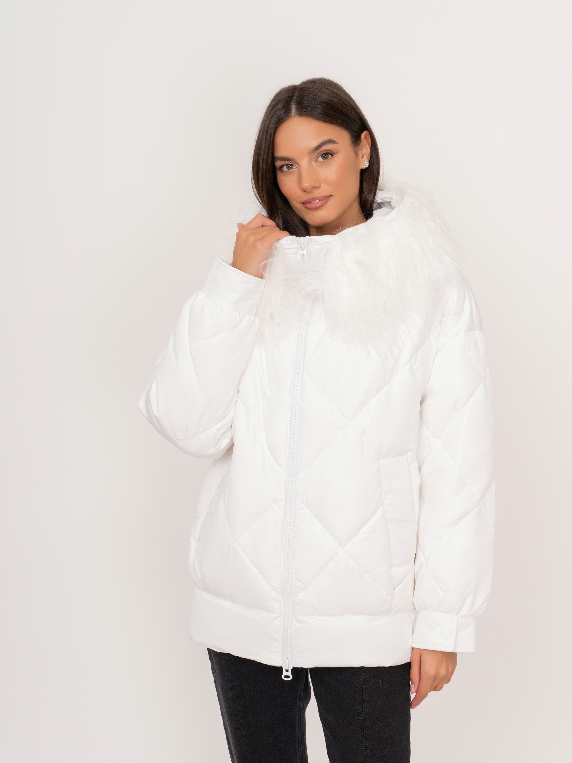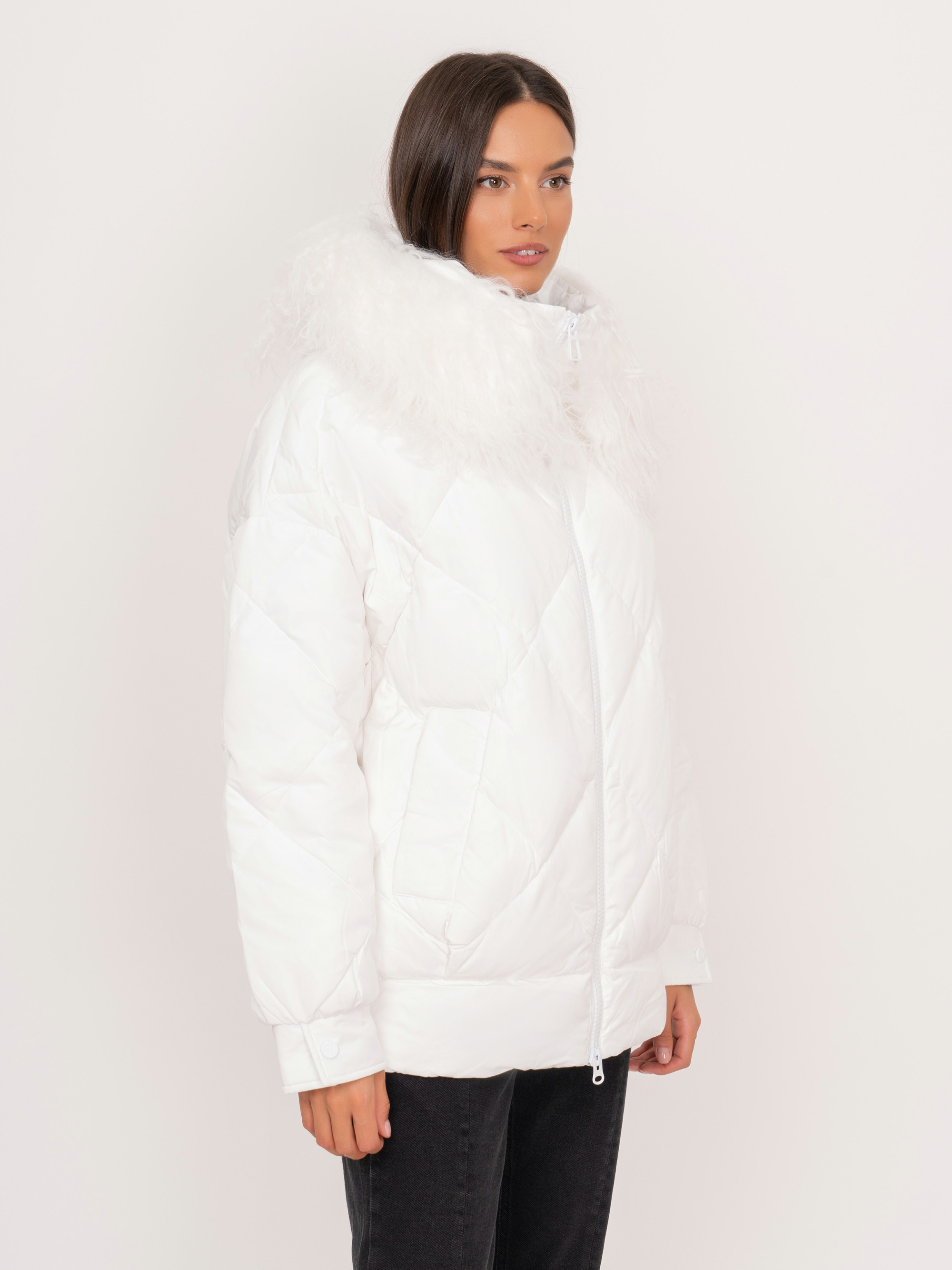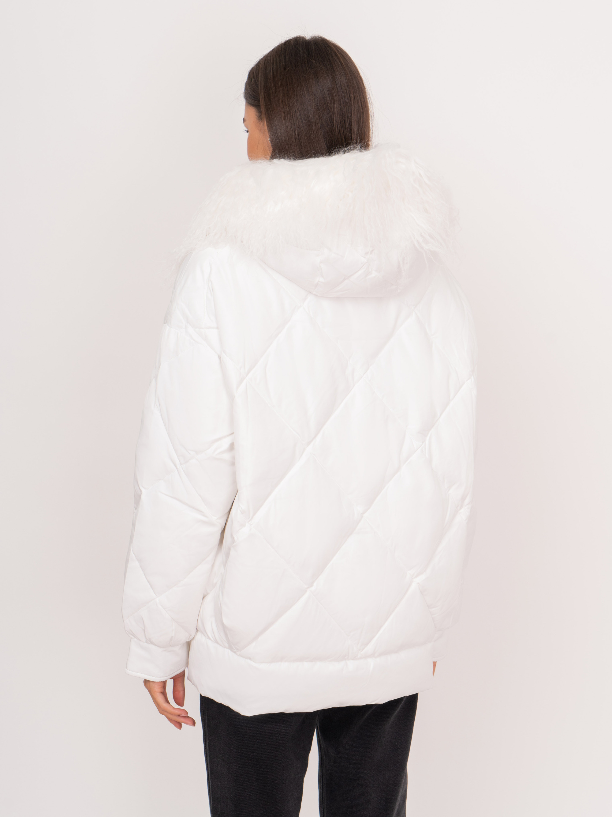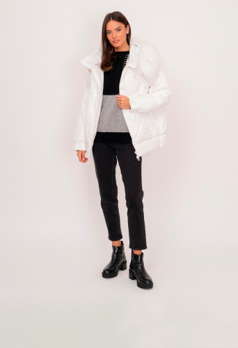 На сайте указаны российские размеры. Полуприталенная пуховая белая куртка на молнии, с капюшоном, со съемной опушкой из 100% натурального меха ламы, с длинными рукавами на кнопках, с прорезными карманами на кнопках. Рост модели: 175 см. Длина по спинке: 69 см.