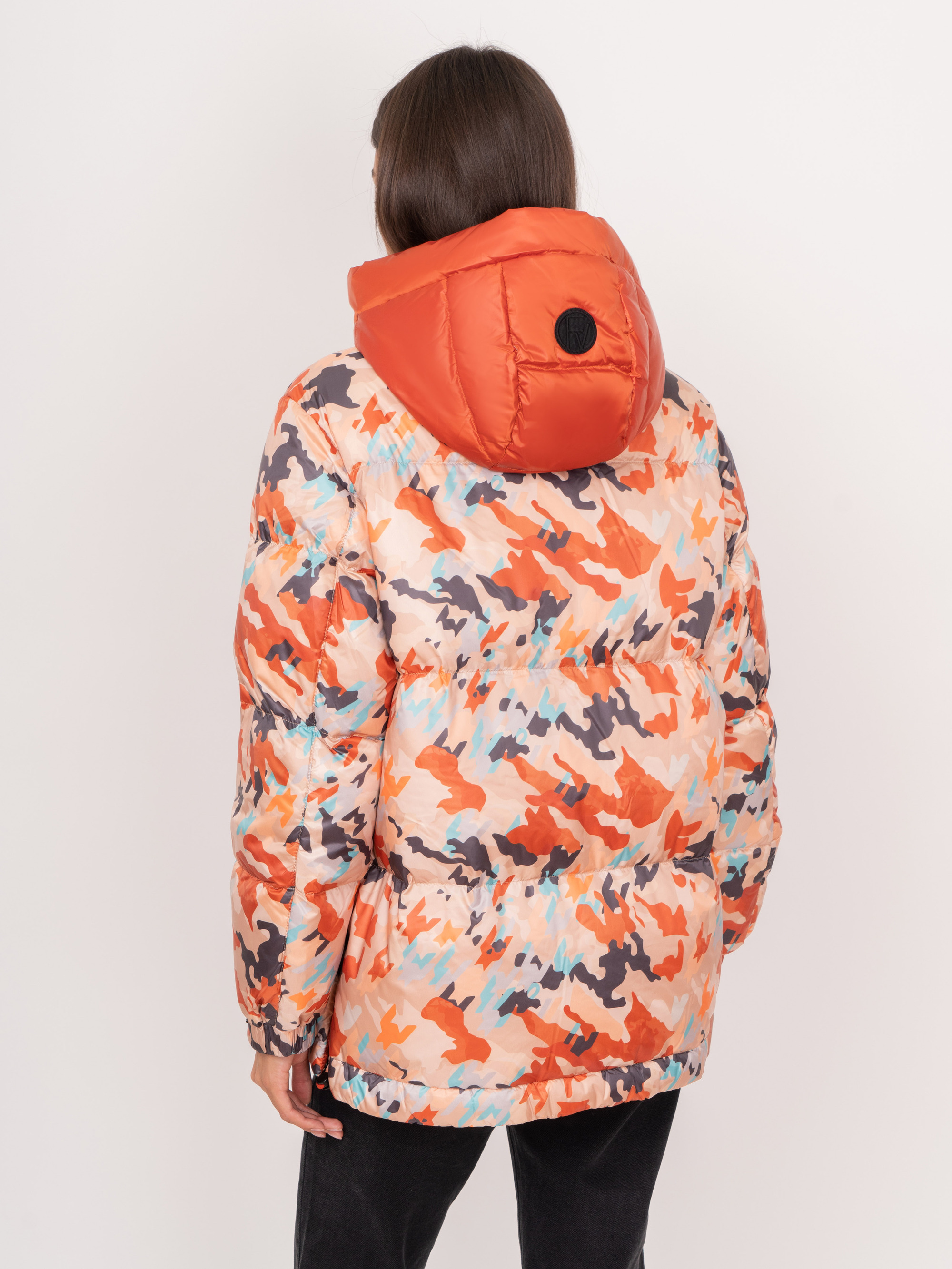 На сайте указаны российские размеры. Утепленная прямая оранжевая куртка на молнии и кнопках , с капюшоном на завязках, с длинным рукавом на кнопке, с прорезными и накладными карманами, с абстрактным рисунком. Рост модели: 175 см. Длина куртки: 69 см.