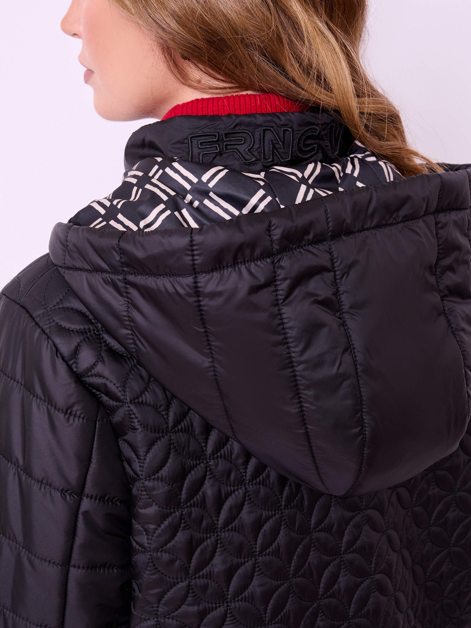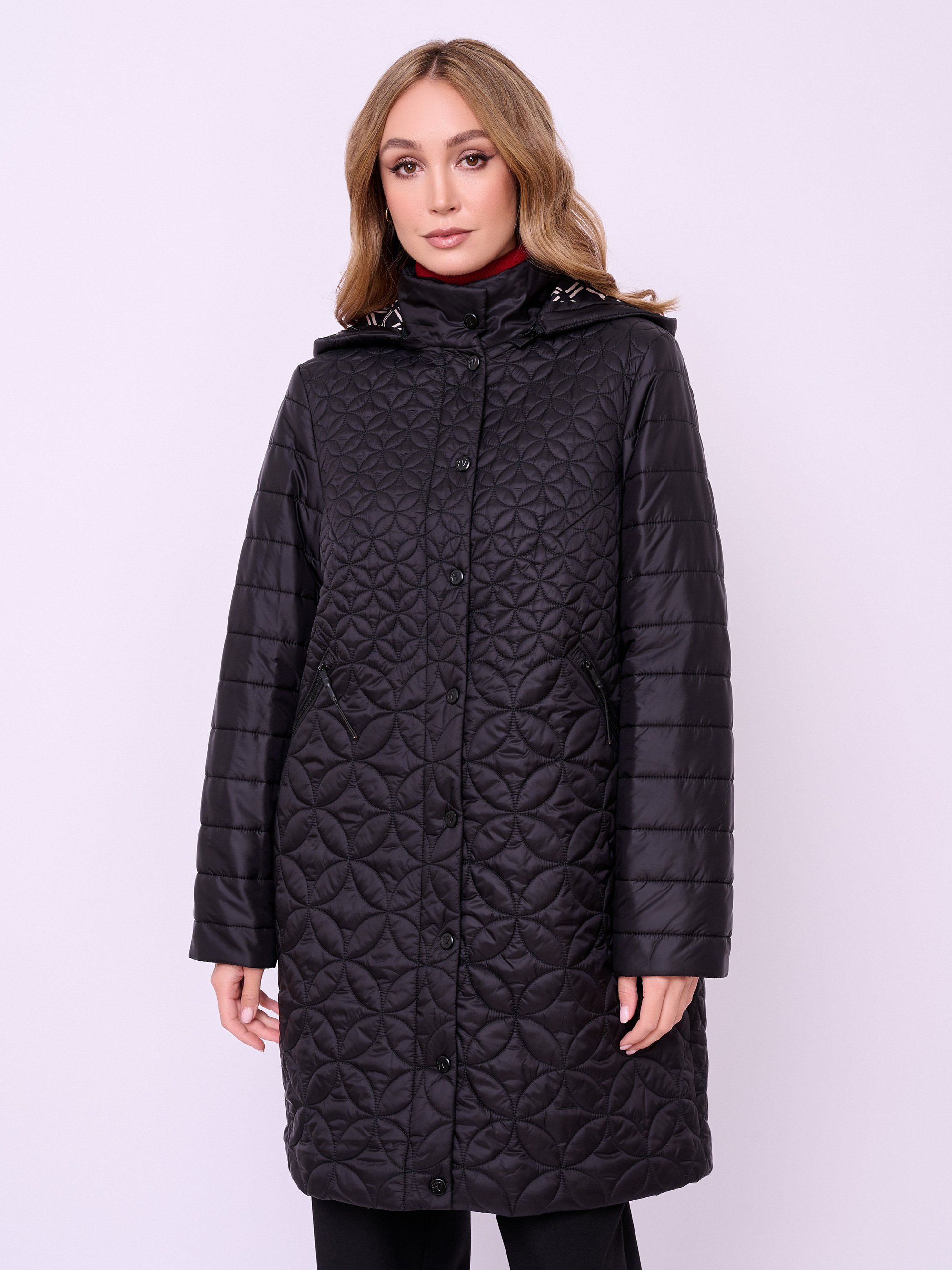 Утепленное стеганое пальто средней длины на молнии со съемным капюшоном, длинными рукавами и прорезными карманами на молнии. Длина по спинке: 90 см. Плотность утеплителя: 100