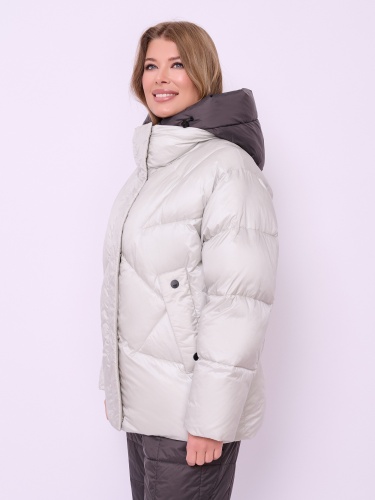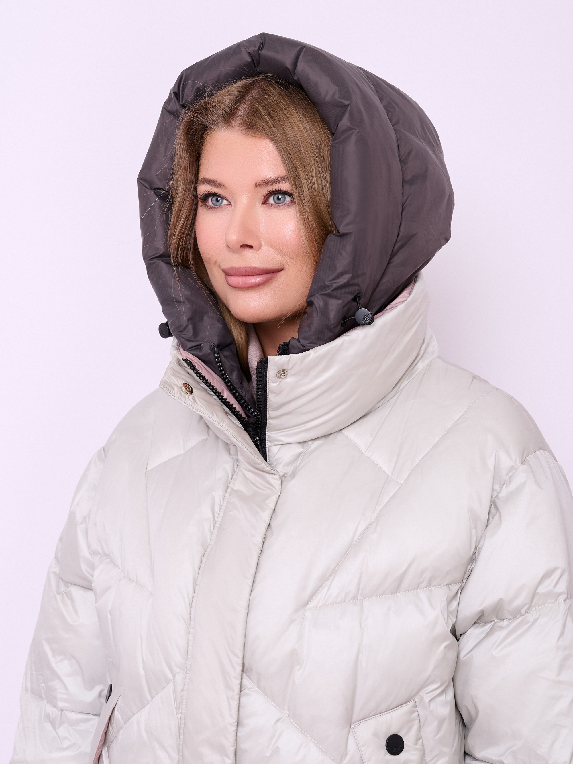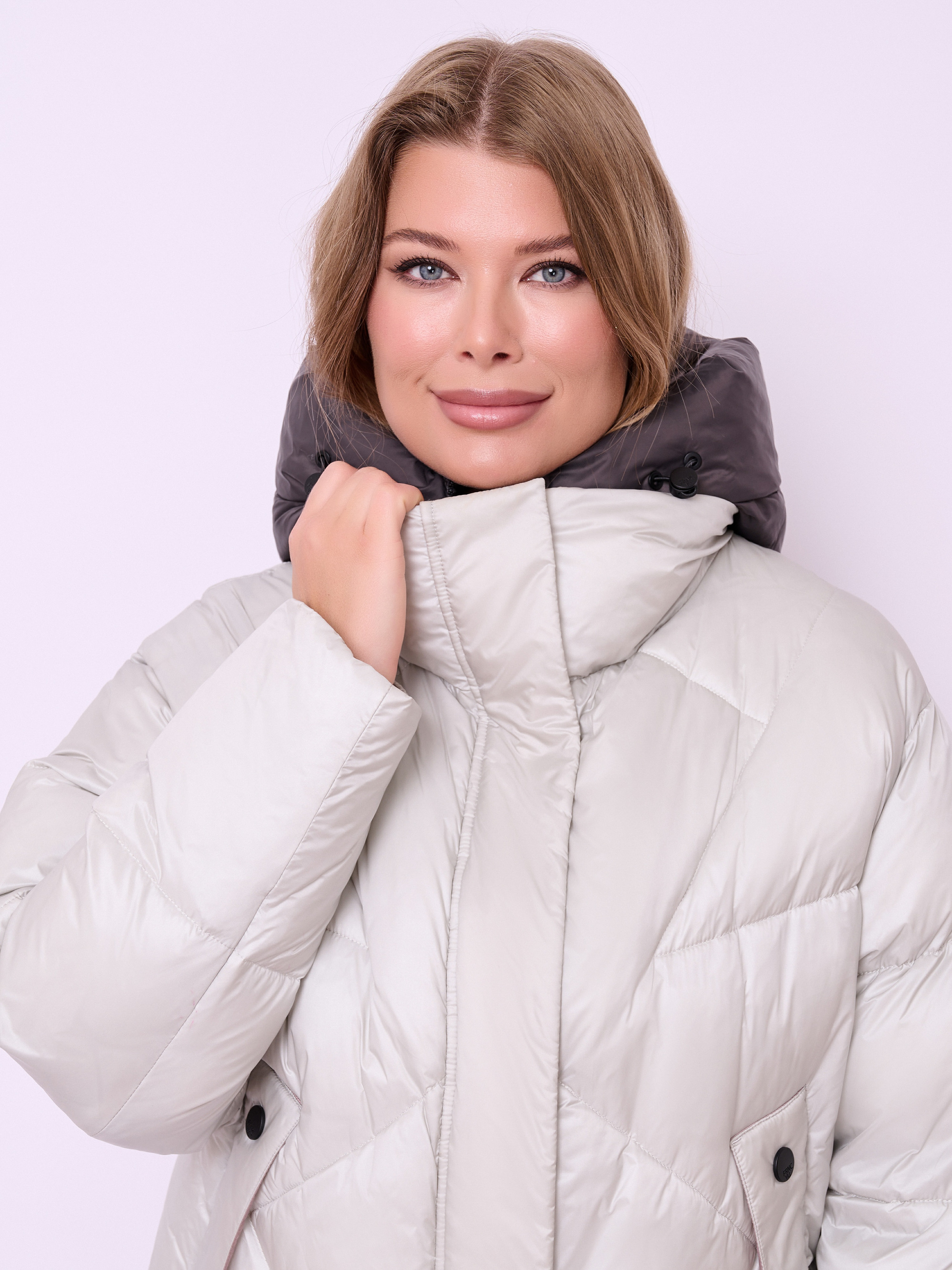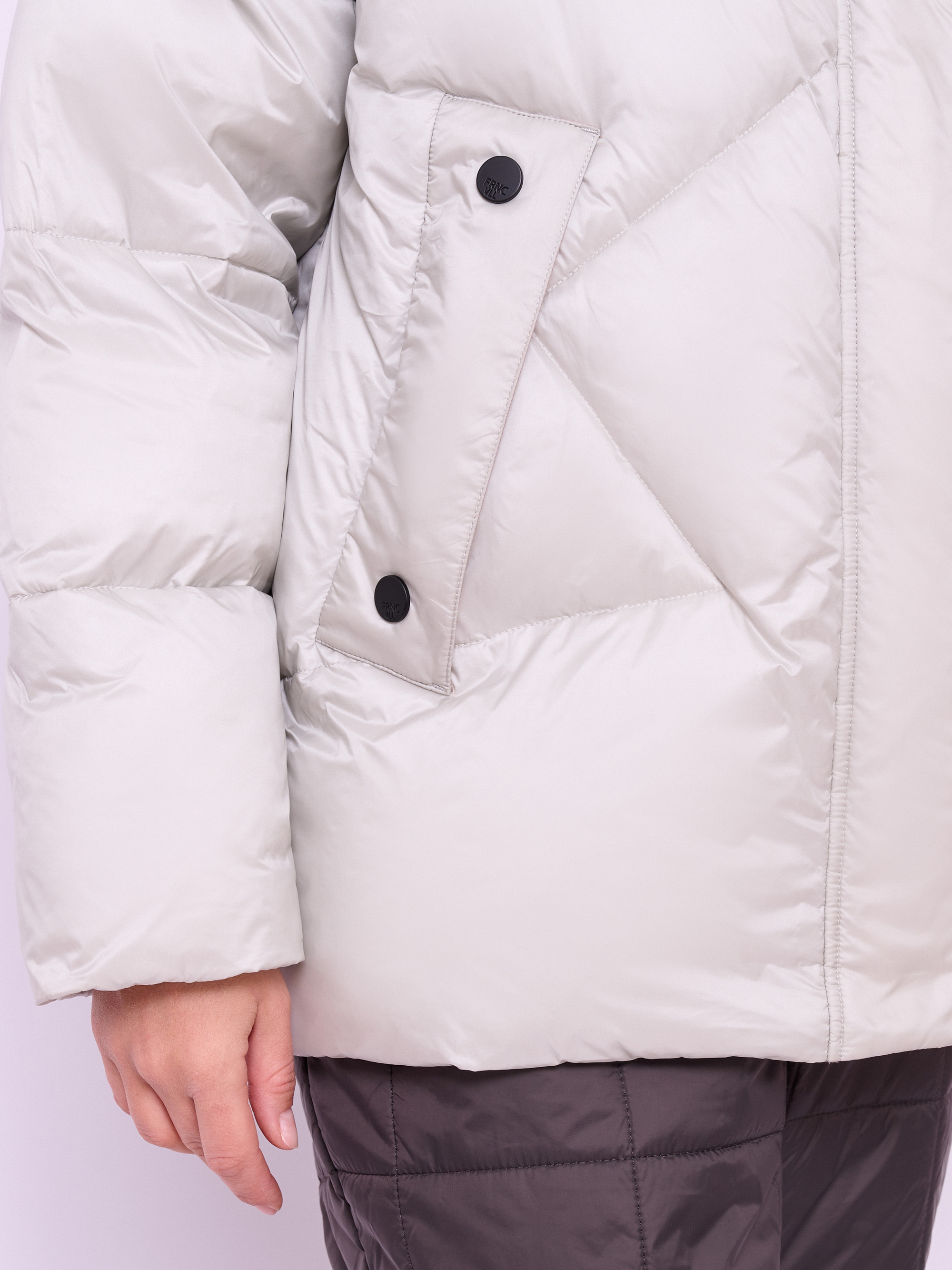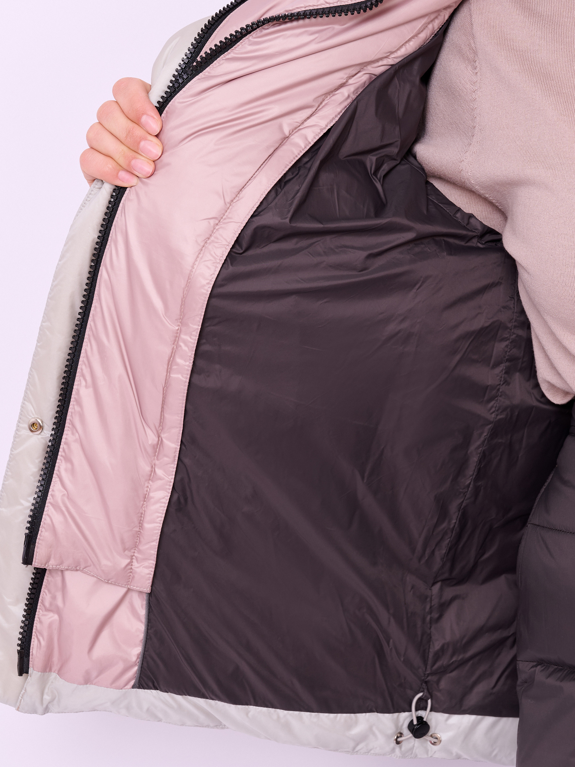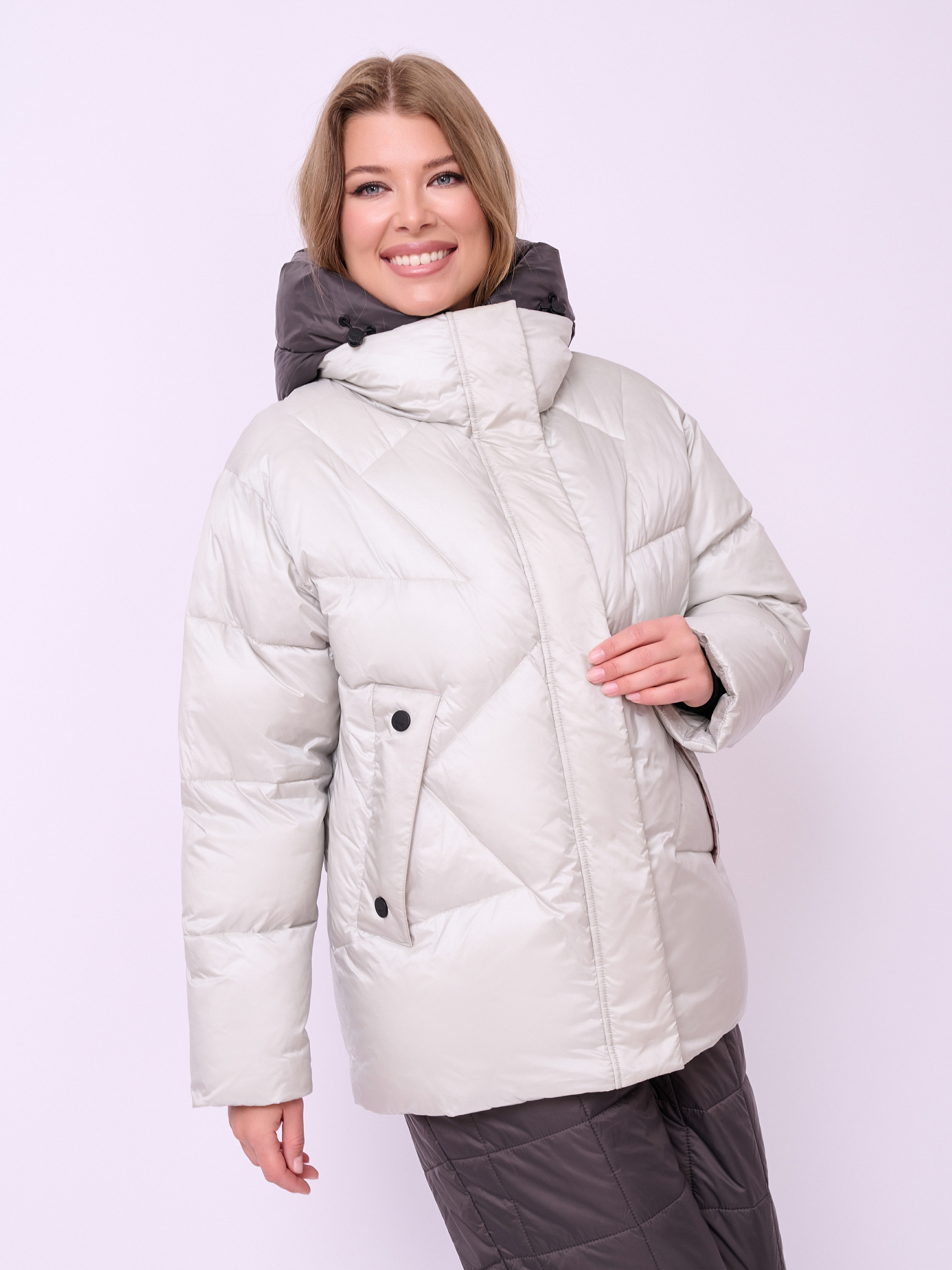 Куртка утпеленная стеганая на молнии и кнопках со съемной манишкой с капюшоном на кулиске, без опушки, с длинными рукавами с трикотажными манжетами, прорезными карманами на кнопках и кулиской по низу.