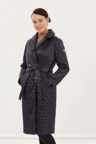 Пальто женское прямого силуэта выполнено из стеганной ткани с сатиновым покрытием. Застежка на кнопках, карманы листочки, отложной воротник. И пояс как отделочный элемент.
