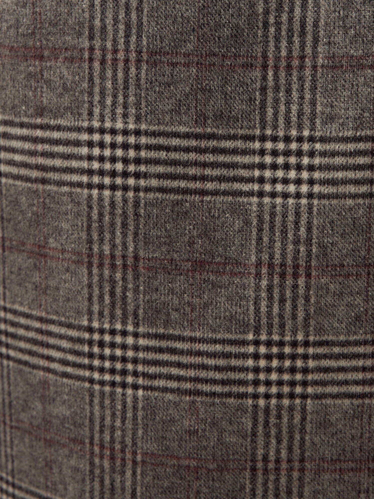 Двубортное пальто с характерным силуэтом "удлиненный кокон" - универсальная вещь для любого гардероба. Комфортный рубашечный рукав со спущенным плечом не стесняет движений. Пальто имеет классический английский воротник, по бокам расположены два глубоких функциональных кармана с зауженными листочками. Пальто модной длины до колена с застежкой на два ряда крупных пуговиц с мягким велюровым покрытием. Спинка имеет дополнительное утепление. Пальто выполнено из пальтовой шерстяной ткани коричневого цвета с модным принтом в клетку.