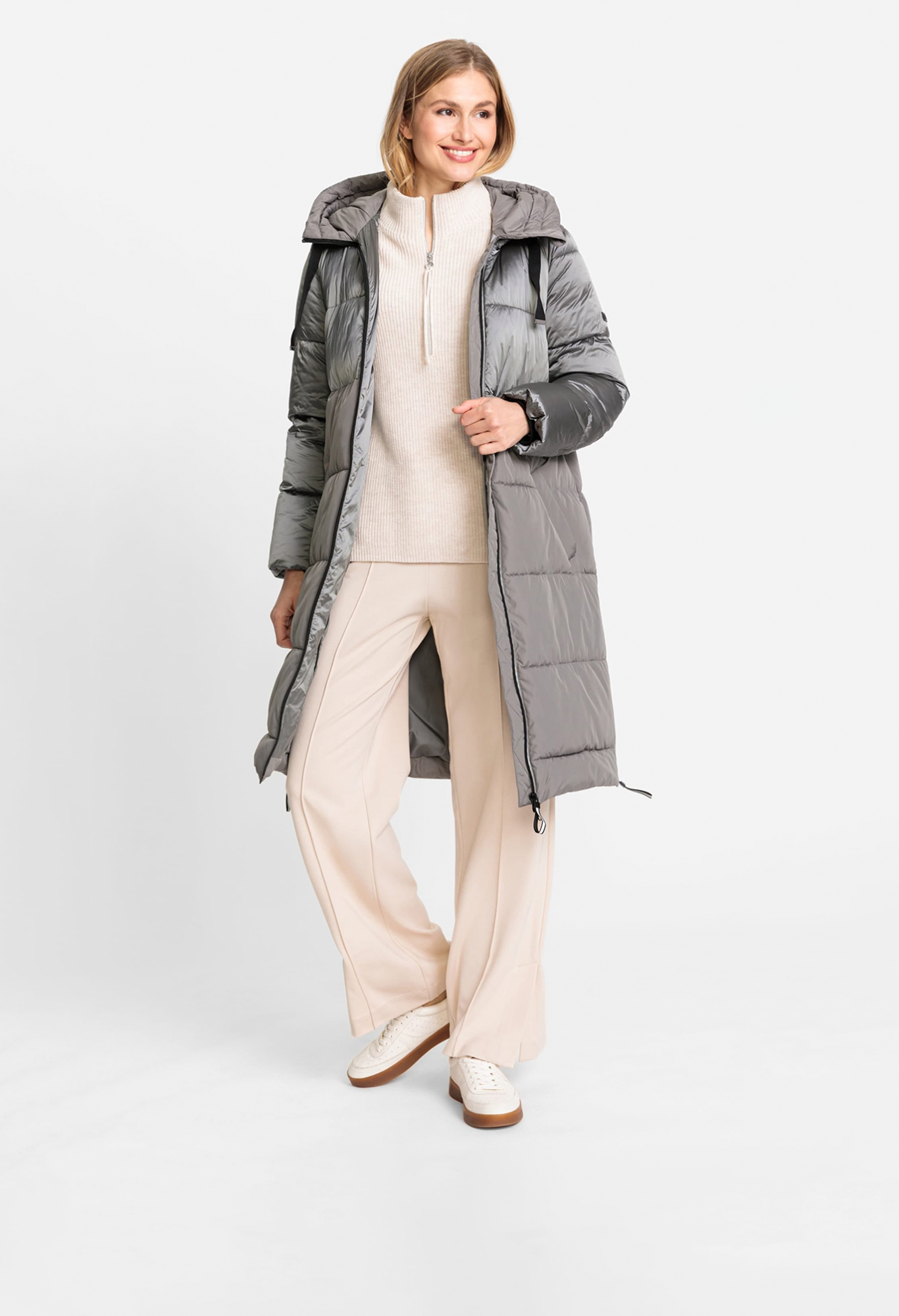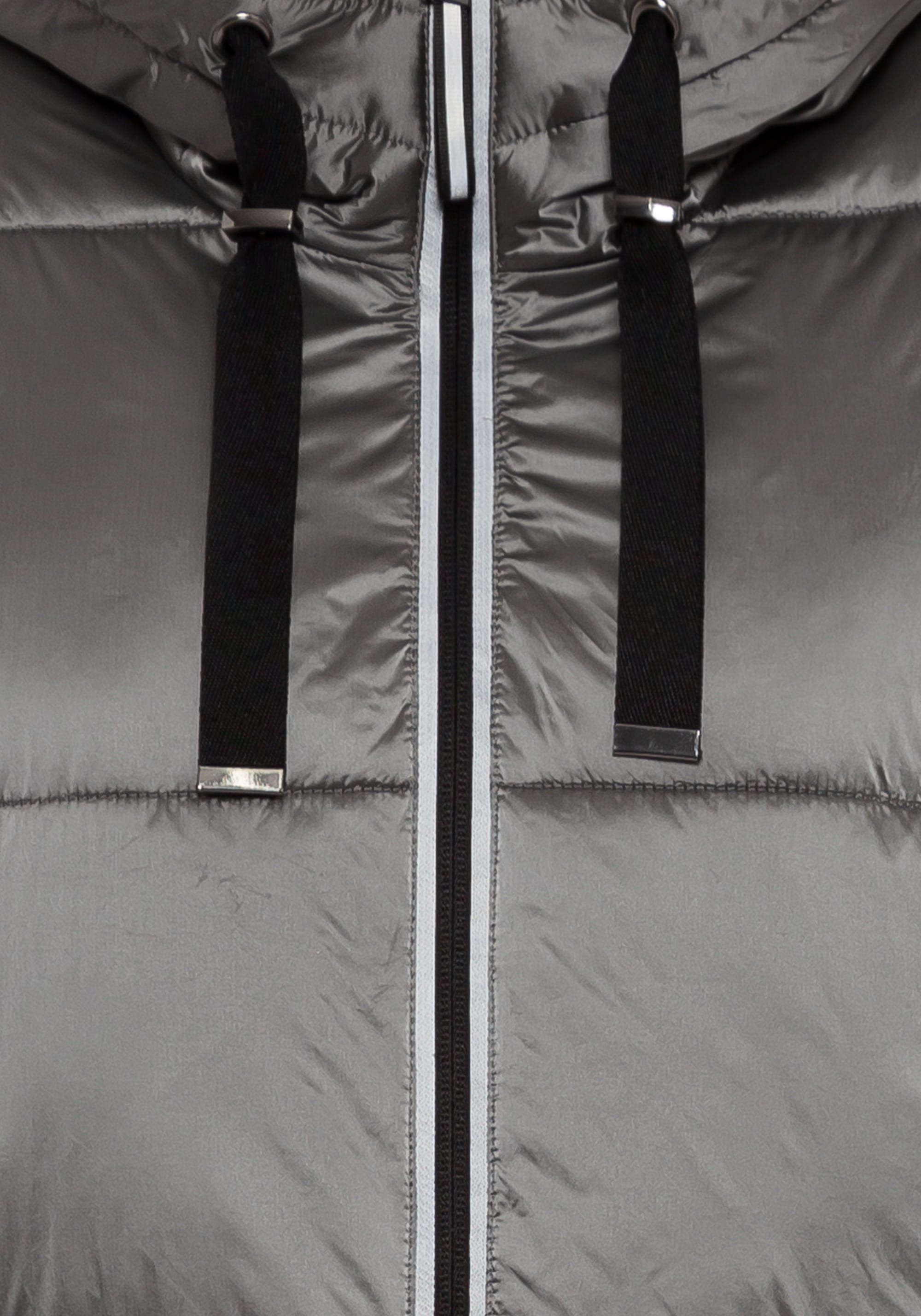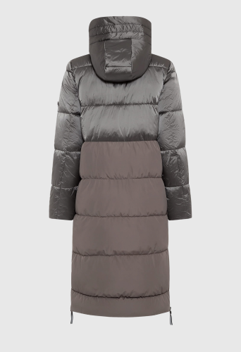 В куртке-пальто сочетаются блестящие матовые ткани одного тона. Широкие молнии по бокам на подоле для расширения формы, функциональная кулиска на капюшоне, двойная молния и потайной внутренний карман. Эта куртка обладает водоотталкивающими свойствами и содержит усовершенствованный синтетический термоизоляционный материал