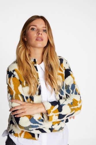 Плюшевая куртка с цветочным узором имеет удобный прямой крой. Он изготовлен из букле и мягкого плюшевого материала. Пуговицы приклеены, карманы пристрочены. Длина для размера 42: 56 см.