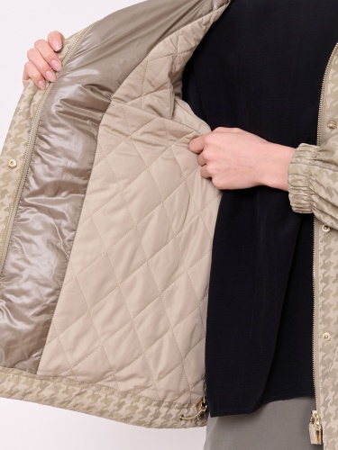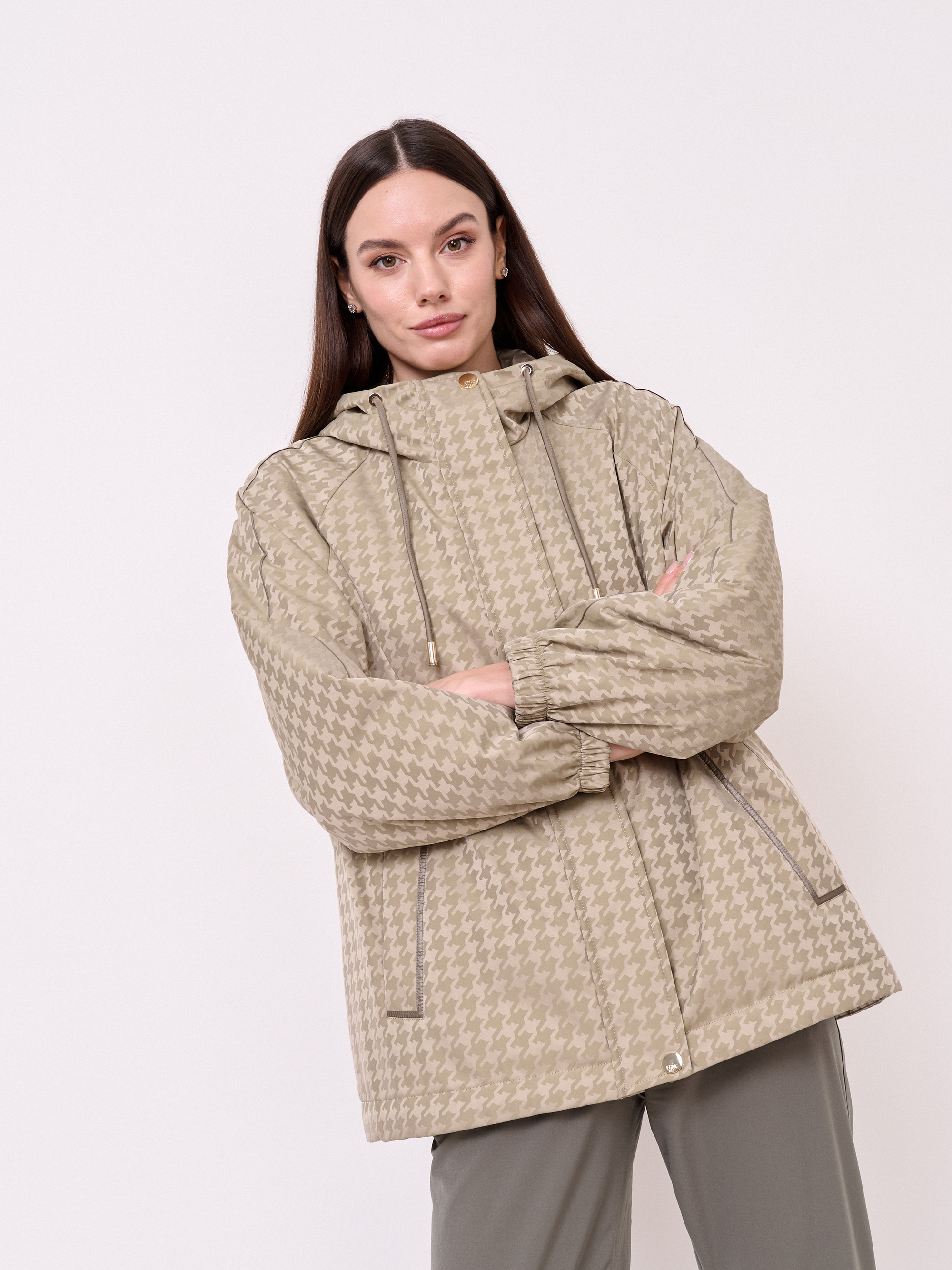 Застежка молния, опции капюшона несъемный капюшон на кулиске, рукава-реглан длинные, покрой прямой, рисунок гусиная лапка, утеплитель полиэстер, карманы прорезные, плотность утеплителя 80, без опушки, золотистая фурнитура. Длина по спинке: 70 см.