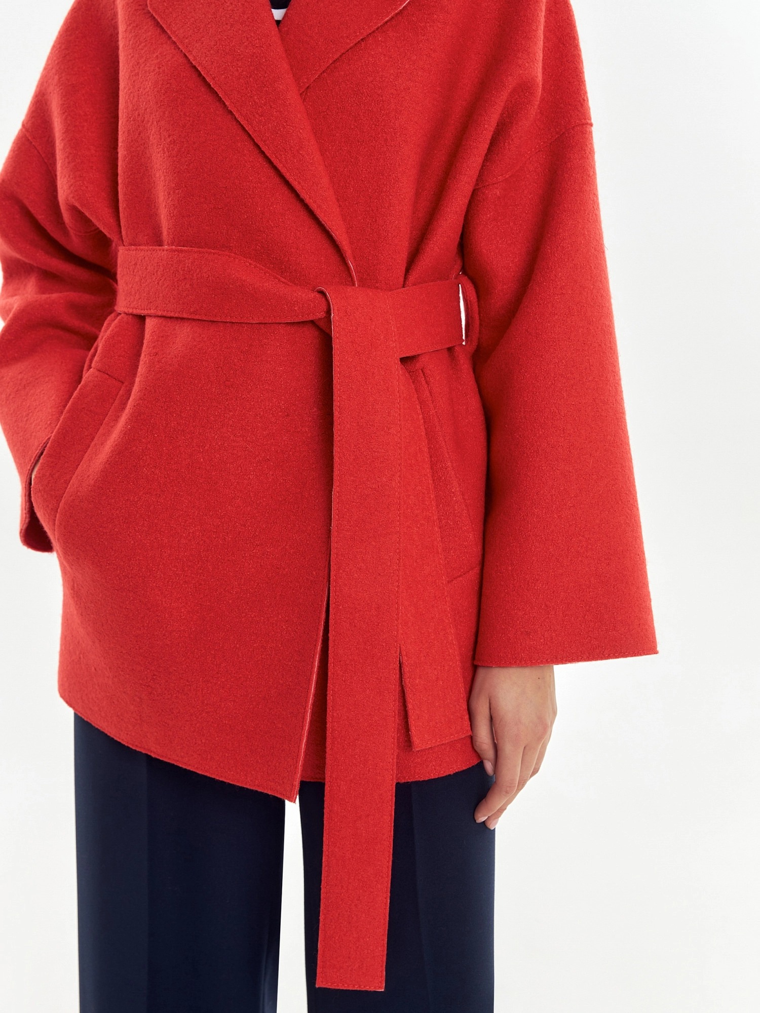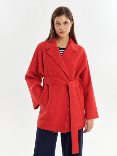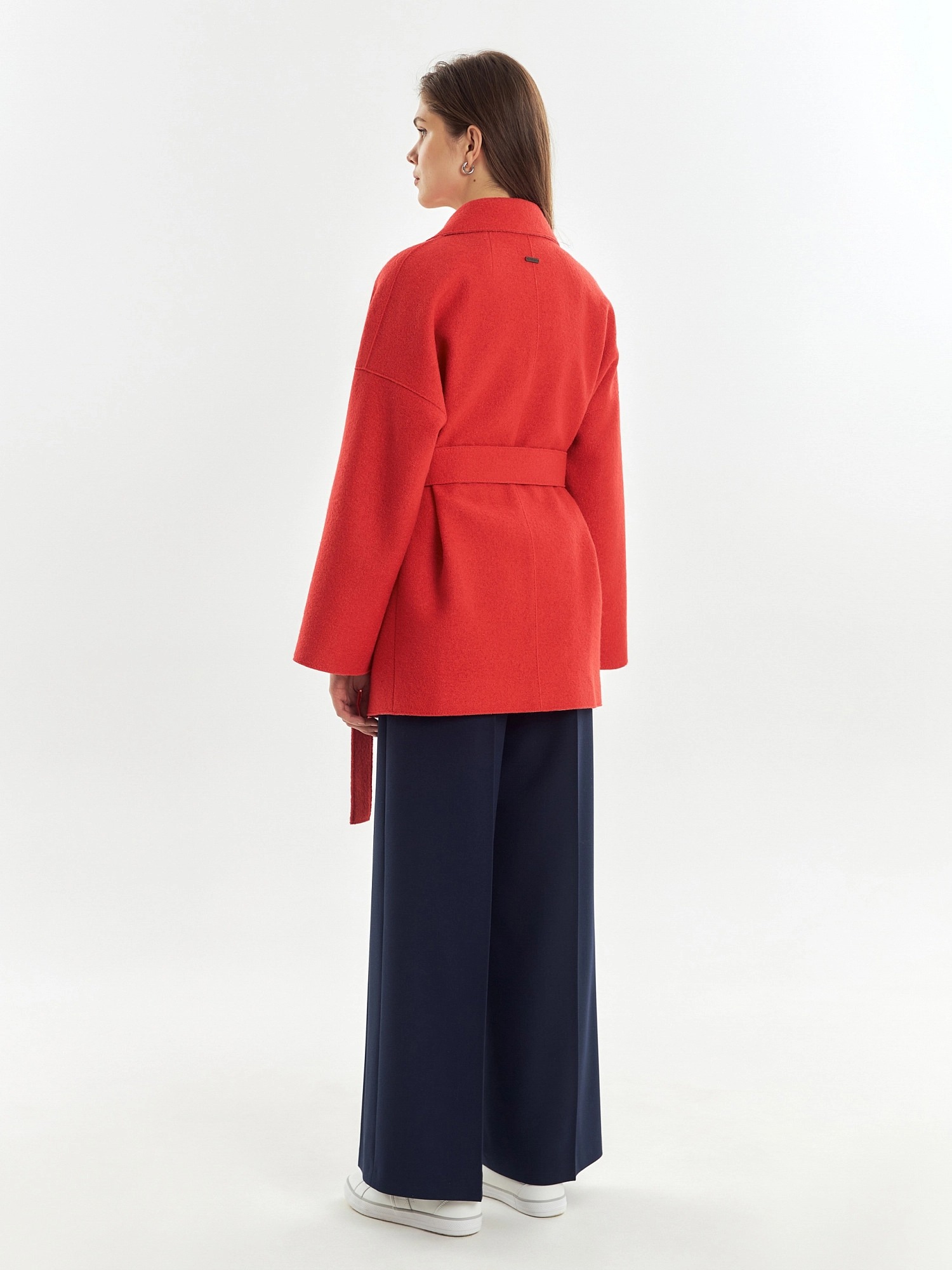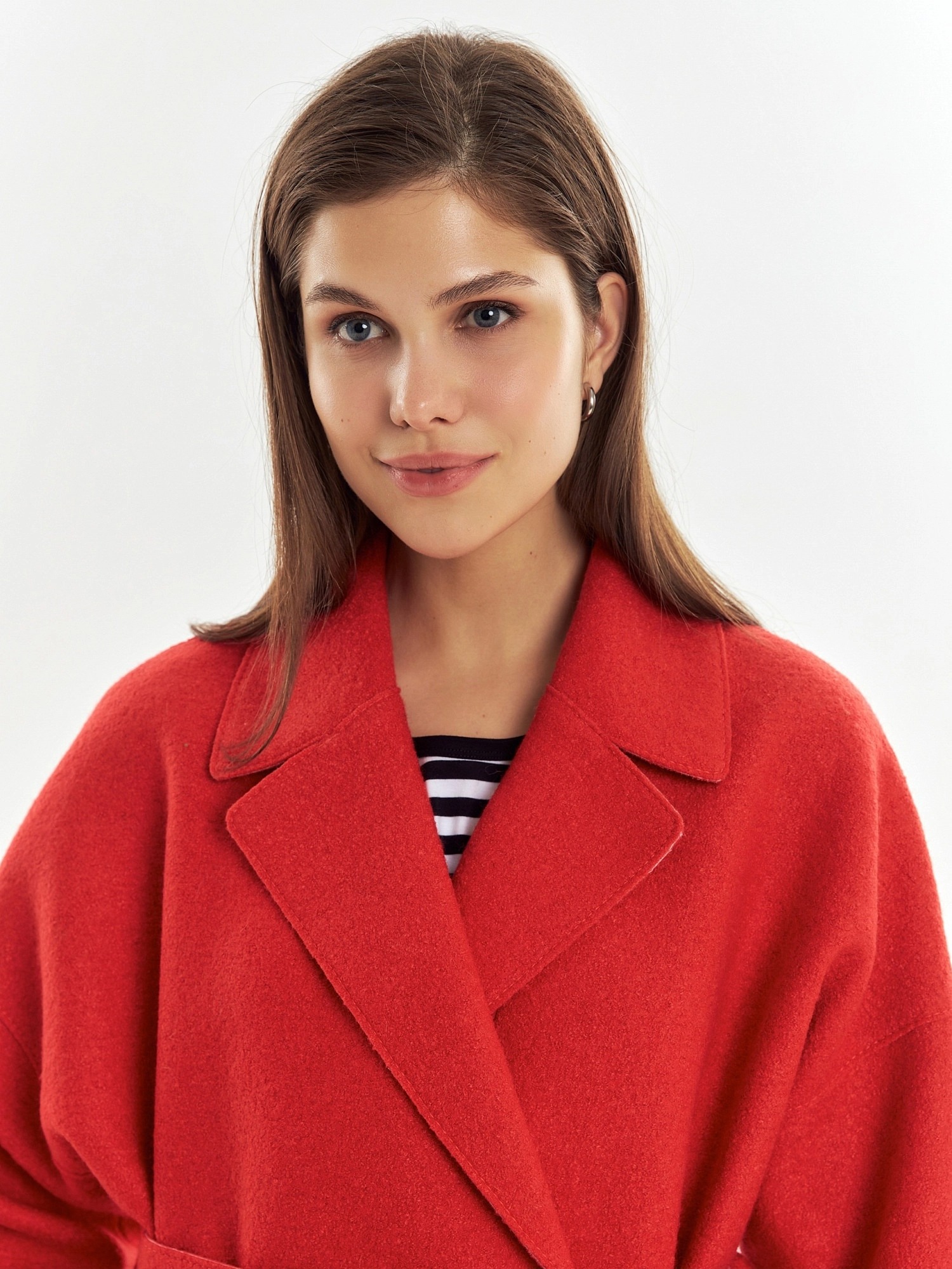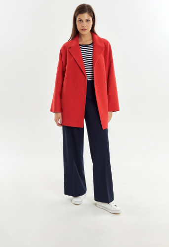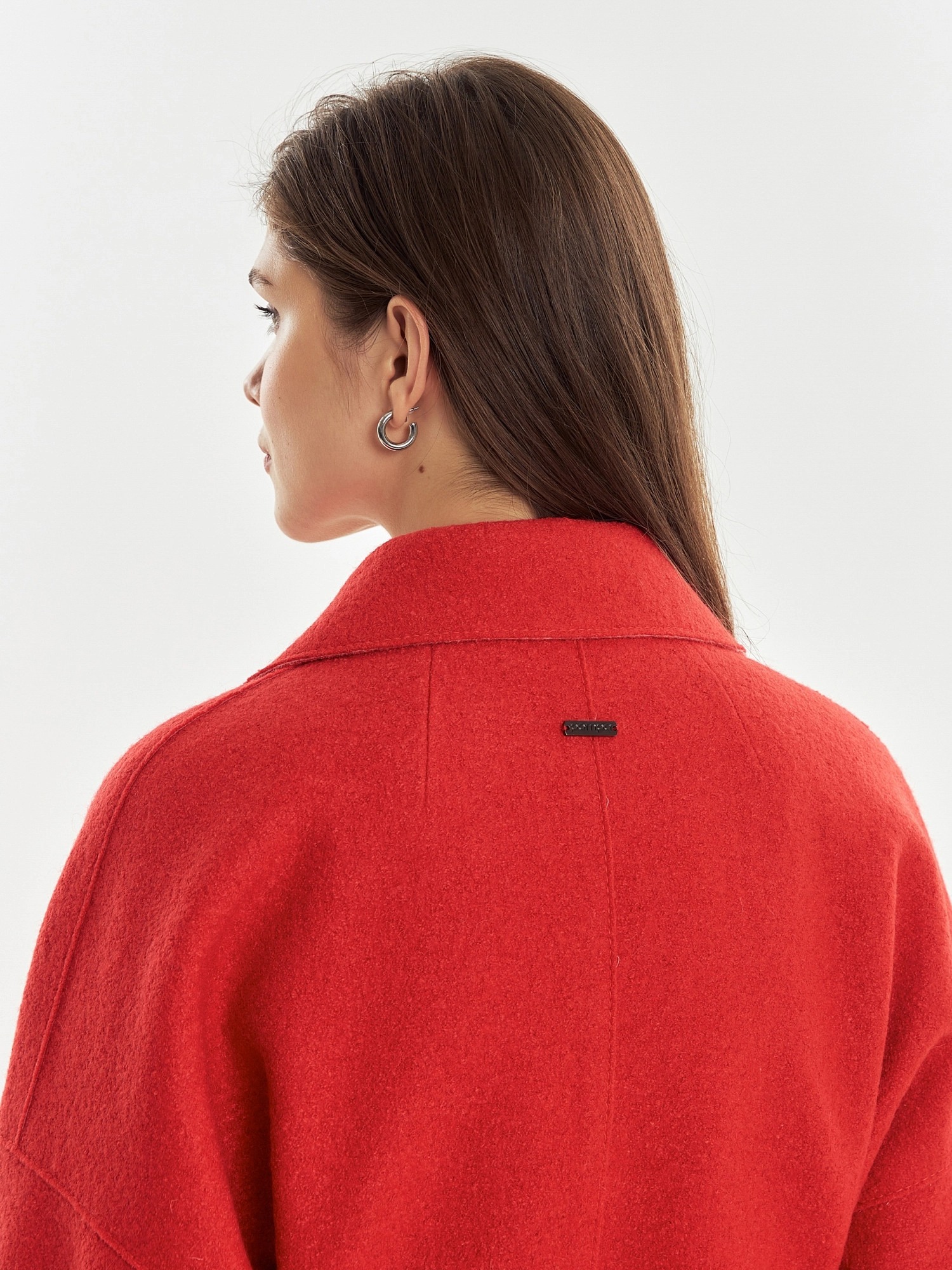 Двубортное полупальто силуэта "кокон" из яркой коралловой ткани с эффектом "вареная шерсть". Широкий английский воротник, застежка на два ряда надежных кнопок, рубашечный рукав с широкой подгибкой низа и глубокие карманы с листочками делают полупальто невероятно комфортным в носке, а цвет и форма - очень стильным и ярким.