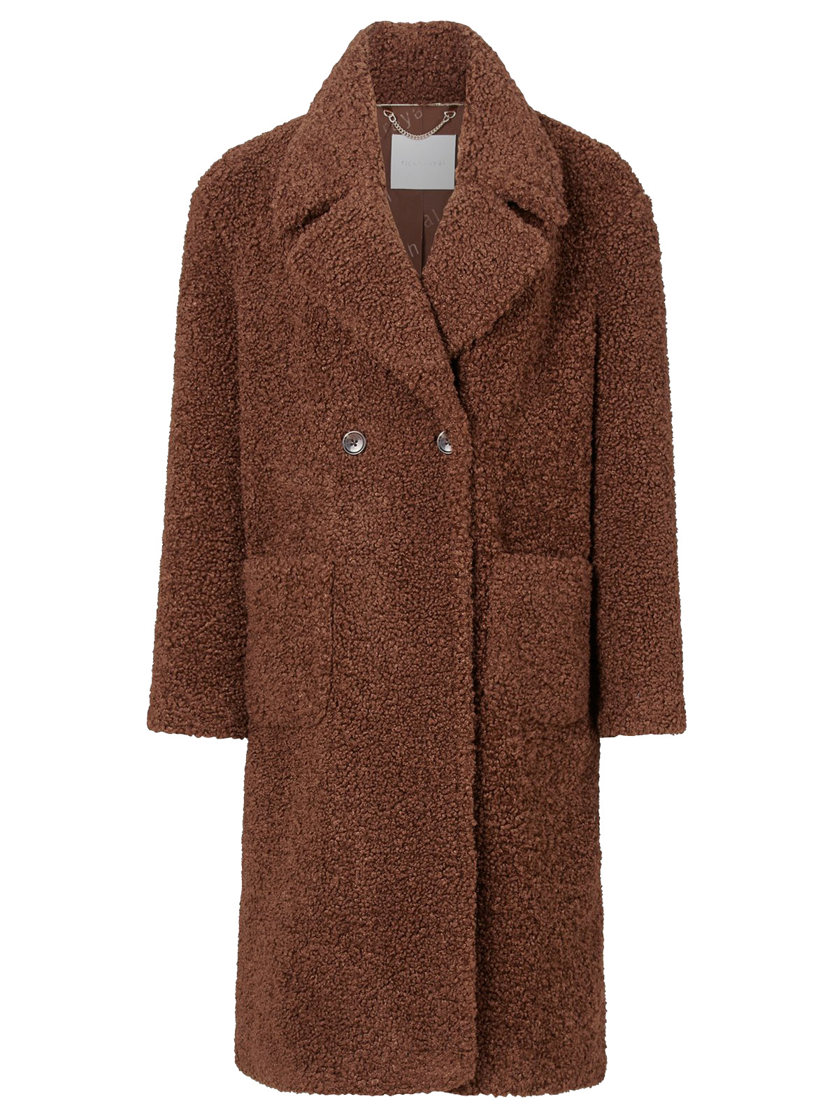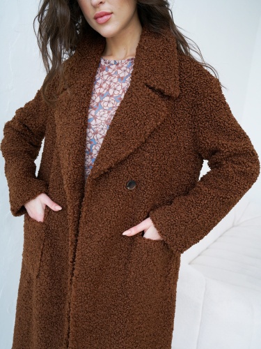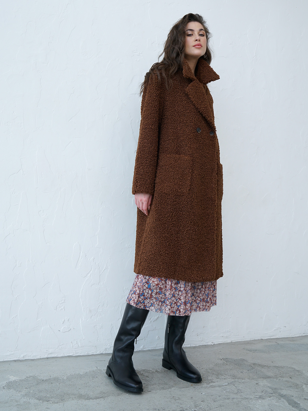 Пальто свободного кроя создано из однотонного искусственного меха. Классический воротник с лацканами, накладные карманы, застежка на пуговицы.