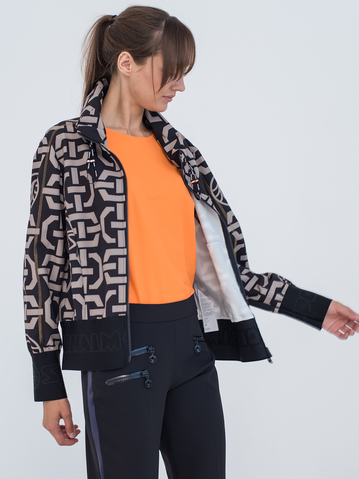 Женская олимпийка SPORTALM c оригинальным принтом по всей поверхности изделия. Воротник стойка, застежка на молнию, длинные втачные рукава с эластичным манжетами. Олимпийка дополнит образы в спортивном или повседневном городском стиле.