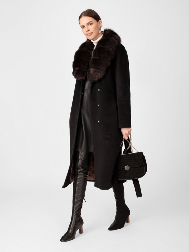 Пальто прилегающего силуэта из шерстяной ворсовой ткани чёрного цвета со съёмным воротником из натурального песца в росшив. Длина ниже колена. Рукава-кимоно с подрезом по низу, застёжка на пришивные кнопки, карманы в рельефах, английский воротник, пояс, шлица в среднем шве спинки. Произведено с ветрозащитной мембраной Raft Pro. Утеплитель DuPont Sorona из биопуха.