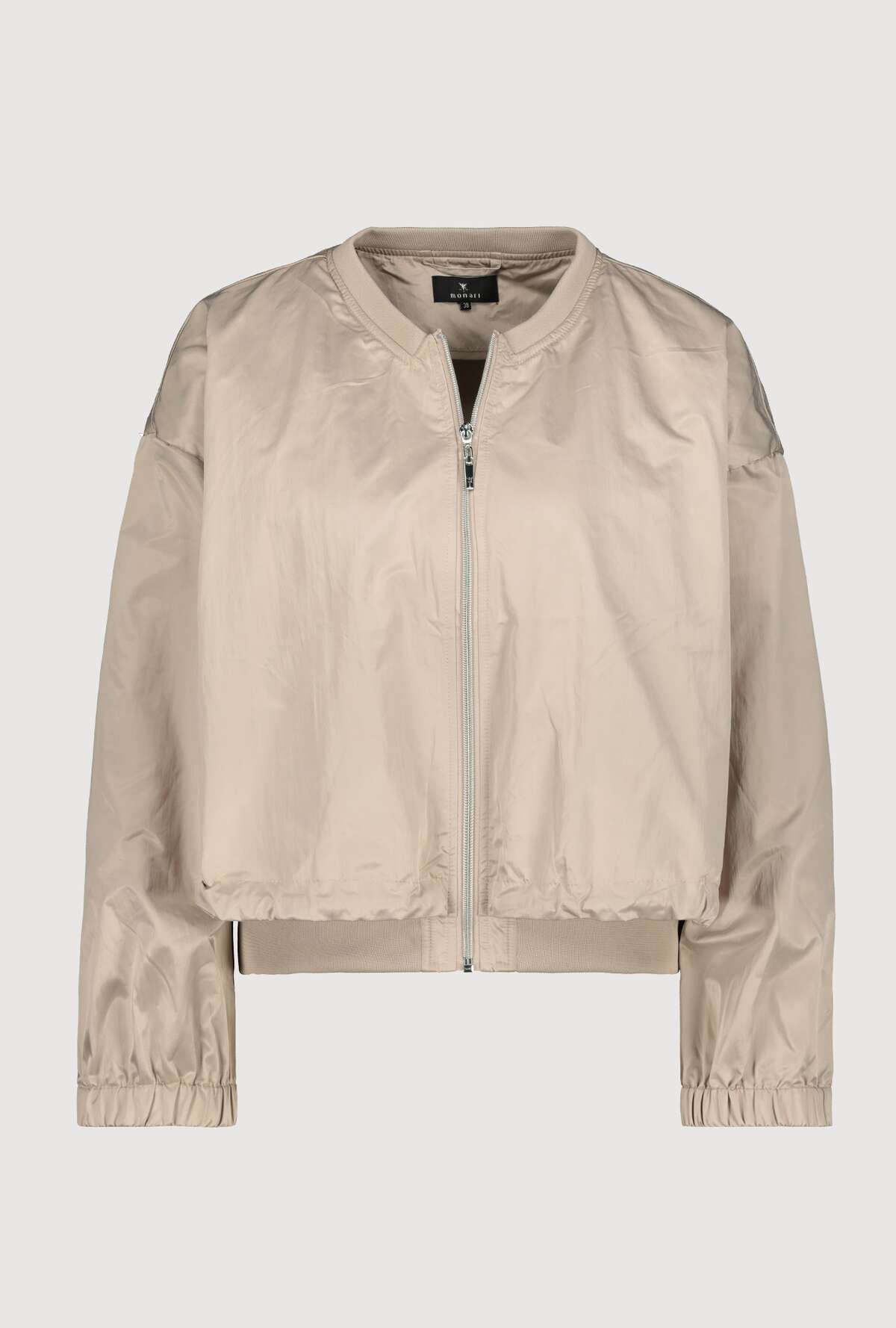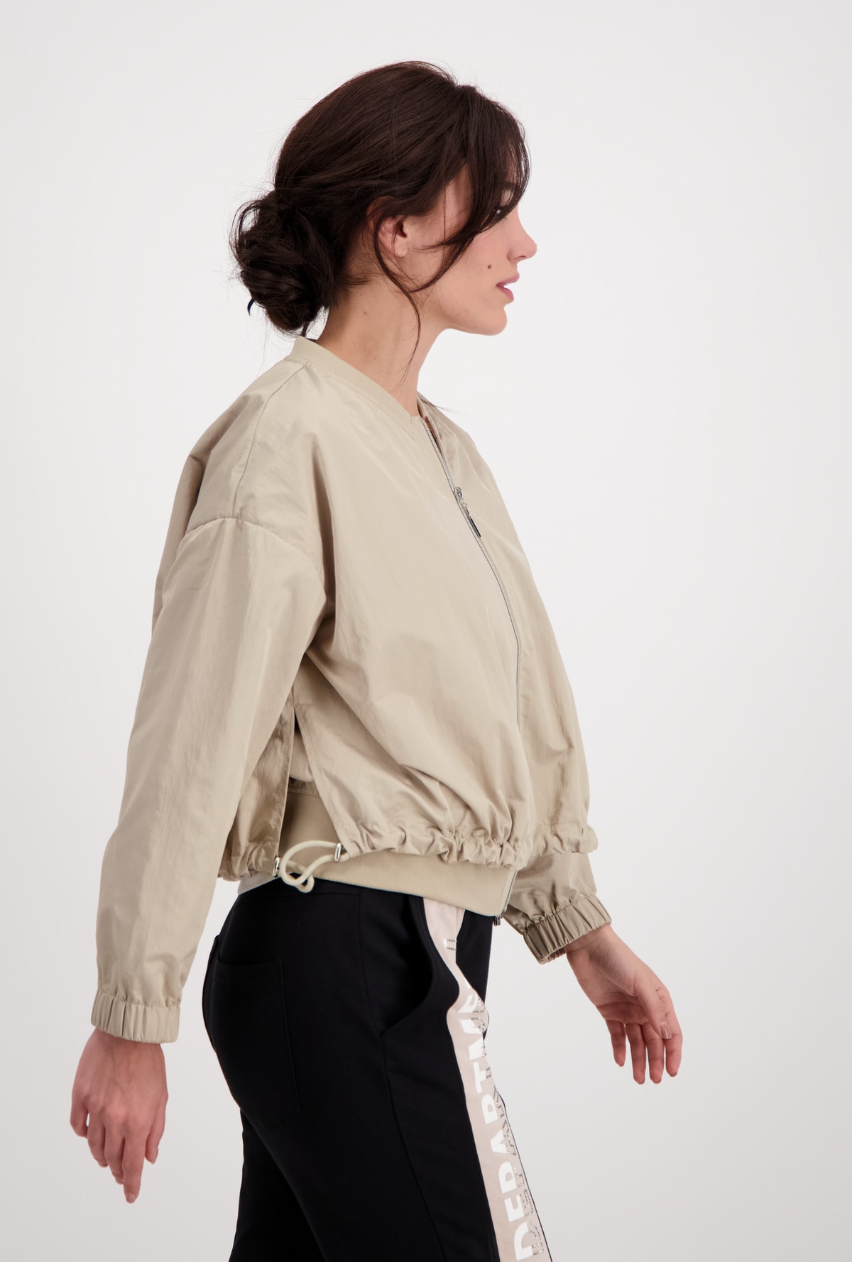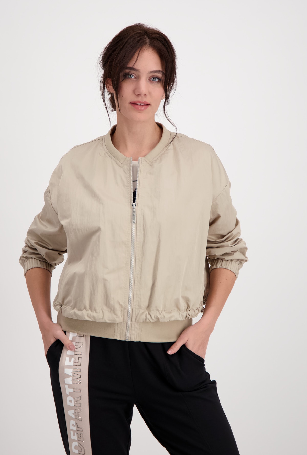 На сайте указаны Российские размеры. Короткая куртка с круглым вырезом и молнией. Прямой крой с круглым вырезом горловины в рубчик, манжетами на резинке и объемными плечами. Модель с длинными рукавами состоит из 2 слоев: верхний слой имеет боковые разрезы, кулиску и резинку с фиксатором шнура, а нижний слой имеет широкие манжеты в рубчик и потайные прорезные карманы. Параметры модели: 42 размер, рост 176 см