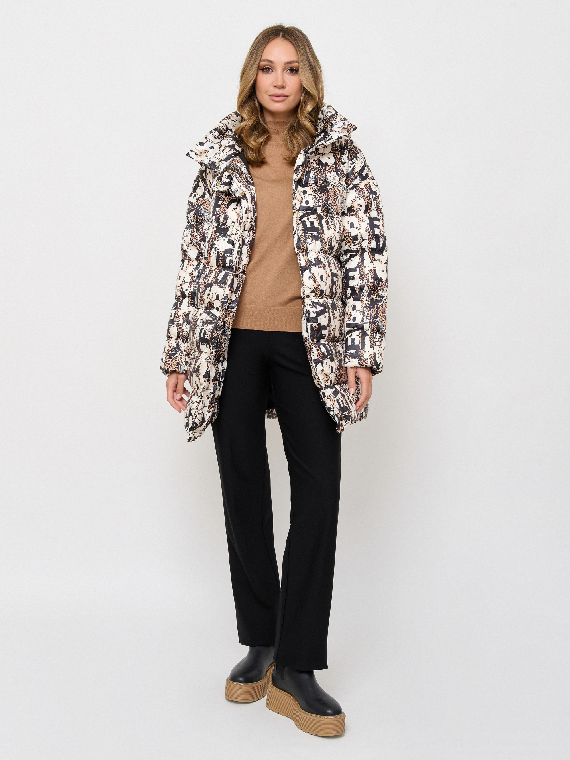 Удлинённая куртка силуэта кокон создана для комфортной защиты в холодную погоду от -5 до -15°C. Ткань верха - микро полиэстер с леопардовый принтом; подкладка - 100% полиэстер; утеплитель - 90% пух / 10% перо. Детали: застежка кнопки, опции капюшона капюшон прячется в воротник, рукава длинные, покрой прямой, рисунок абстракция, утеплитель пух, карманы прорезные, без опушки.