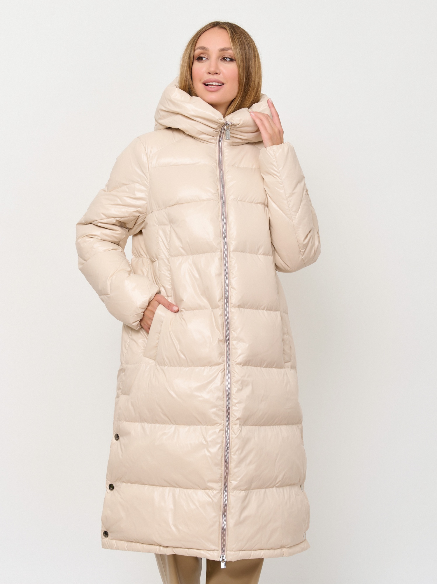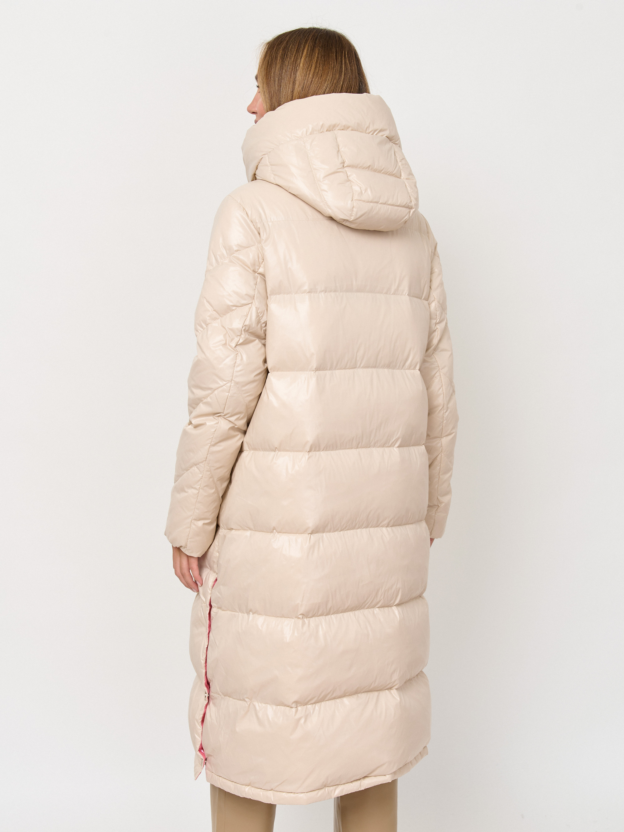 Воздушный пуховик-кокон, рассчитан на температурный диапазон от -5 до -15°C. Ткань верха - 100% нейлон в оттенке розовый кварц с лёгкой виниловой накаткой; подкладка - 100% микрополиэстер; дополнительная ткань - отделочная ткань: 100% нейлон с накаткой эффекта PU нежно-кораллового цвета; Утеплитель - высококачественный 90% пух / 10% перо. Детали: застежка молния, опции капюшона несъемный капюшон, рукава длинные, покрой прямой, без рисунка, утеплитель пух, карманы прорезные, без опушки, борты однобортное.