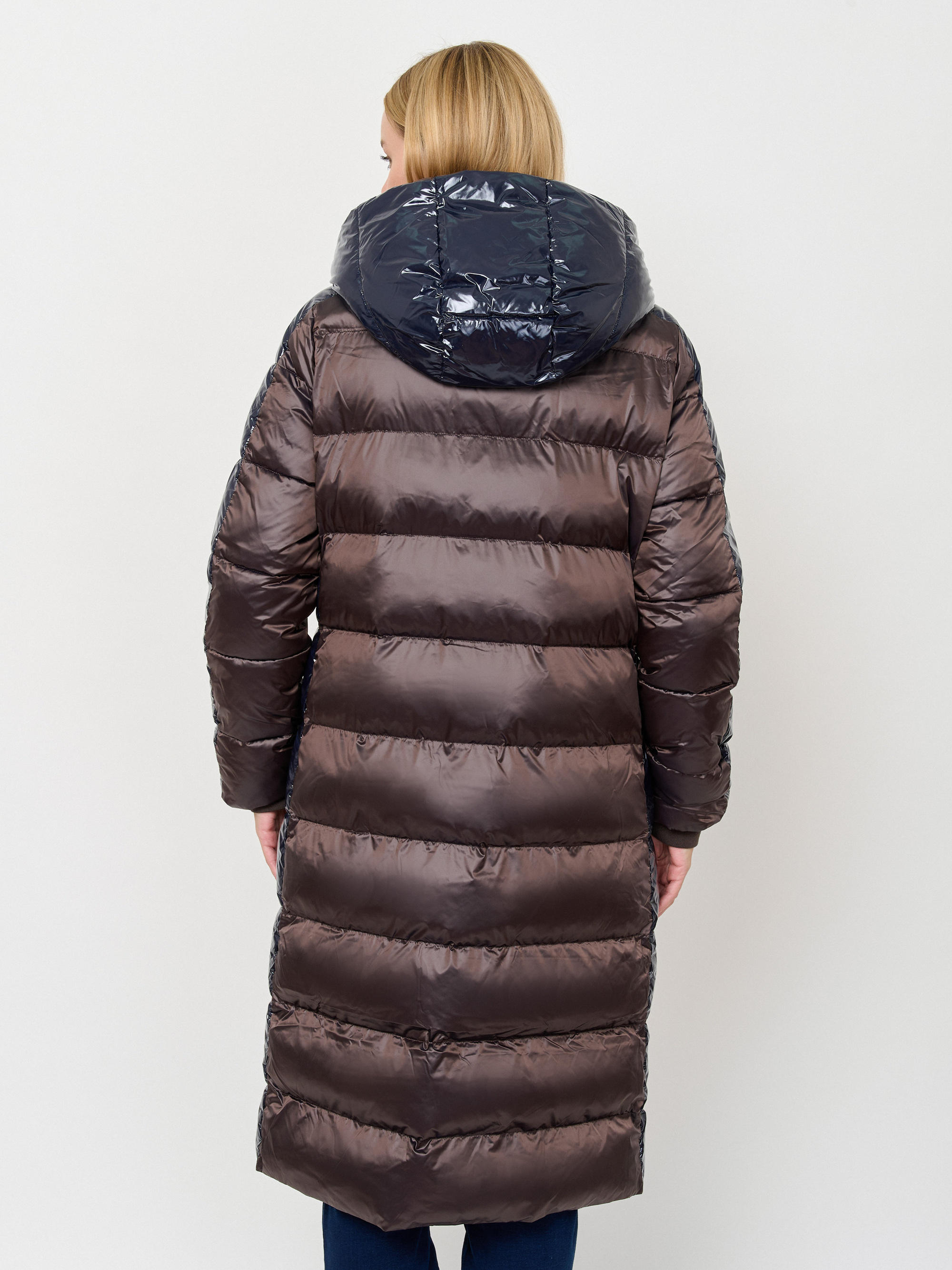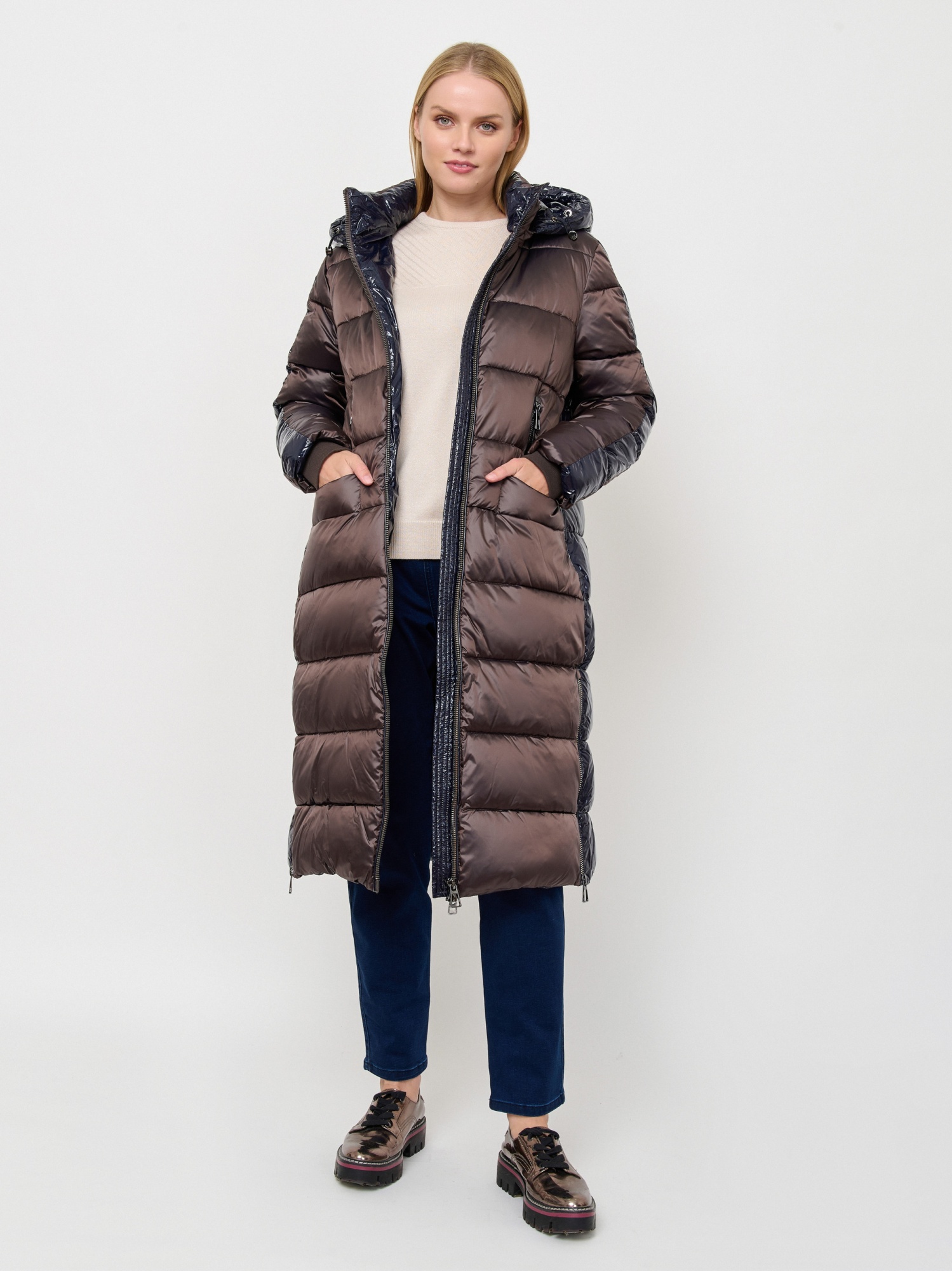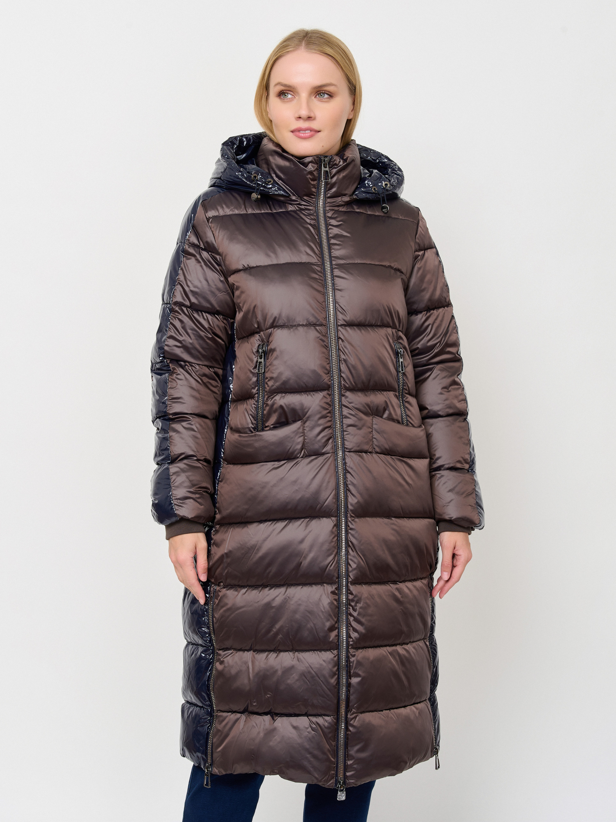 Пуховик прямого силуэта со вставками из блестящей ткани подходит для температурного режима от -5 до -15°C. Ткань верха: плотный тутонистый нейлон с сатиновым эффектом; дополнительная ткань: нейлон с виниловым эффектом глубокого-синего цвета;"подкладка: комбинация мягкого сатинового нейлона терракотового и графитового оттенков; утеплитель: cинтепух DuPont Sorona (100% полиэстер). Детали: застежка молния, опции капюшона съемный капюшон, рукава длинные, покрой прямой, без рисунка, утеплитель полиэстер, карманы прорезные, без опушки, борты однобортное.