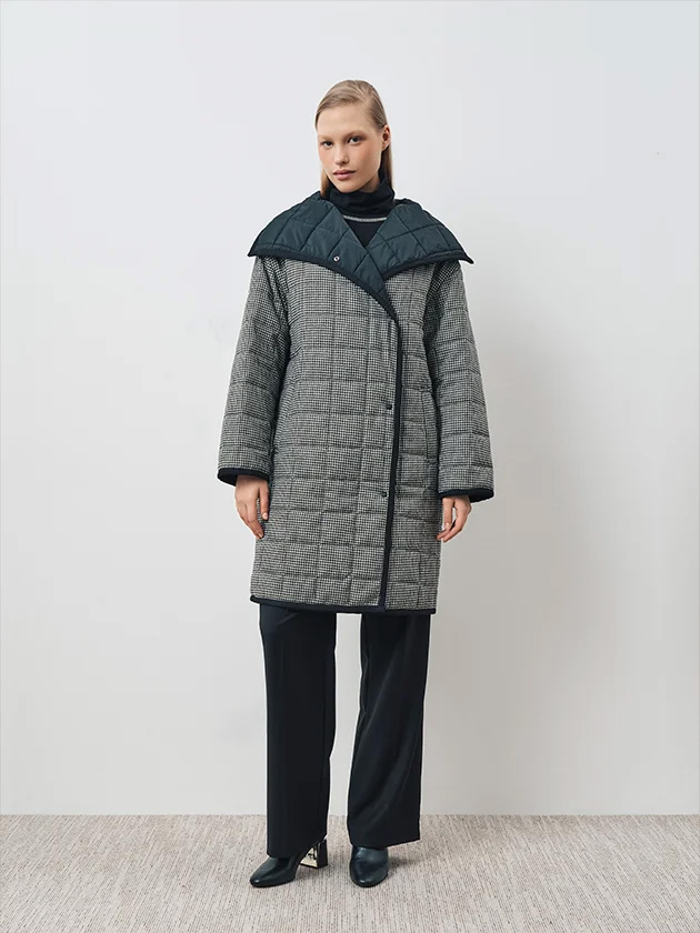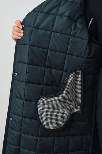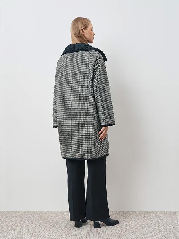 Пальто прямого силуэта, из стеганой ткани "сэндвич". Верхний слой из шерстяной ткани, внутри утеплитель, нижний слой плащевка. Пальто без подкладки. На полочке прорезной карман листочка с настрочными концами. Застежка двубортная на 4 пробивные кнопки по краю правого борта и одну верхнюю кнопку по краю левого борта. Воротник "апаш". Плечо спущенное. Рукав рубашечного покроя, одношовный с нижним швом. Край борта, воротника, низ рукава и низ изделия окантованы отделочной тесьмой .