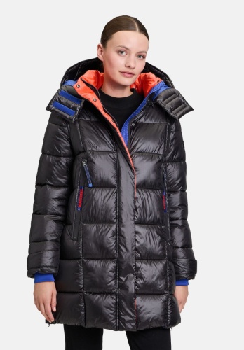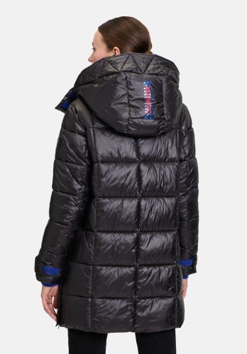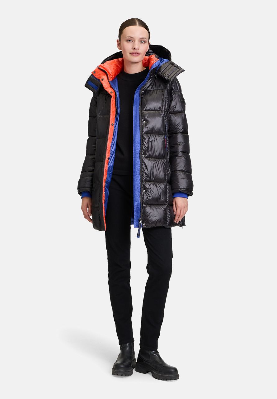 Пуховик Betty Barclay с капюшоном. Ультрамодная стеганая куртка от Betty Barclay с контрастными цветами на капюшоне, внутреннем воротнике и подкладке – определенно модный must-have! Водонепроницаемые черные молнии на карманах с цветным принтом и принт с логотипом на капюшоне расставляют особые акценты. Спортивная куртка приятна в ношении и очень удобна. Круто и непринужденно!