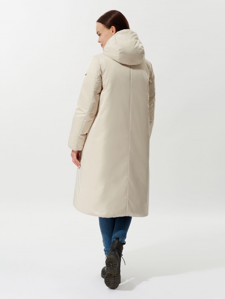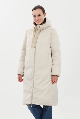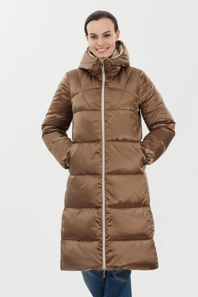 Пальто женское двустороннее прямого силуэта выполнено из водоотталкивающей ткани с матовым сатиновым покрытием. Застежка по борту на молнии, карманы листочки и на потайных молниях. Втачной капюшон с кулиской и декоративной тесьмой. Утеплитель: 90% натуральный пух, 10% перо.