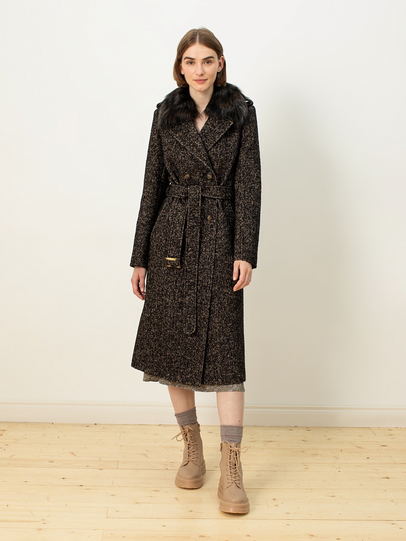 Двубортное пальто полуприлегающего силуэта из шерстяного твида со съемным воротником из искусственного енота. Втачной рукав, застёжка на роговые пуговицы, карманы с клапанами, пояс, шлица, погоны. Изделие декорировано широкой отделочной строчкой.
