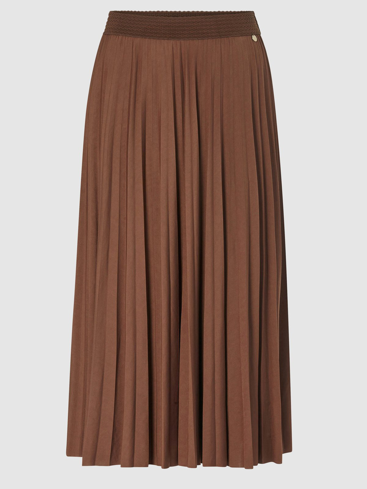 Плиссированная юбка длины миди в базовом коричневом оттенке. Эластичный пояс обеспечивает комфортную посадку по естественной линии талии. Юбка хорошо сочетается с разной обувью как в классическом, так и в спортивном стиле.