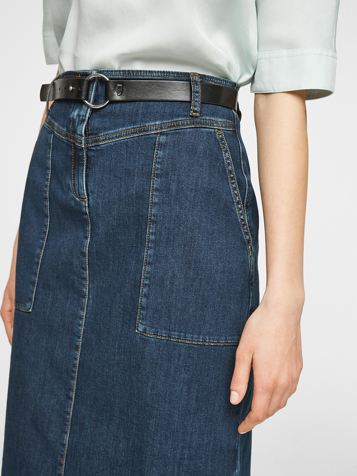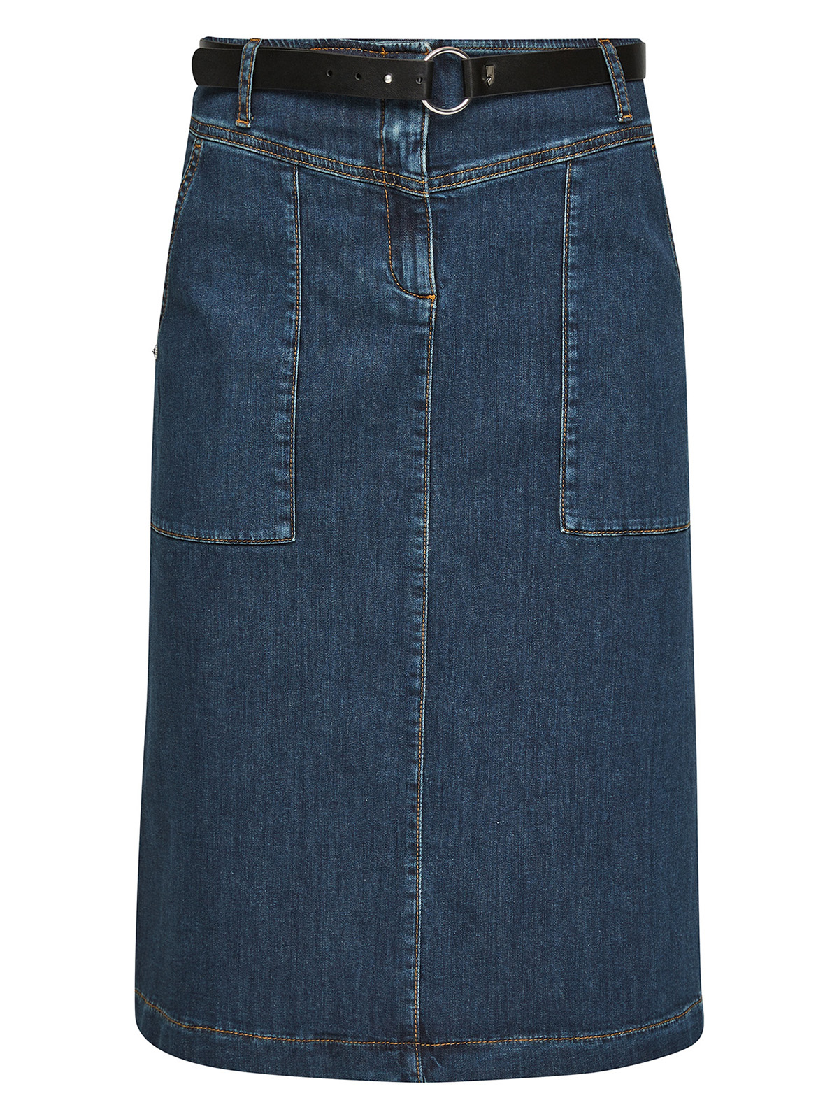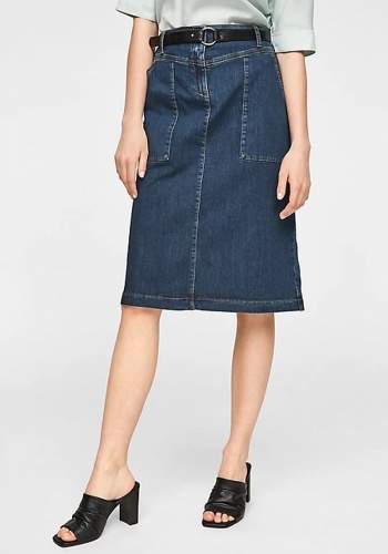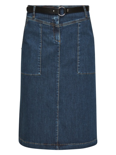 Джинсовая юбка длины миди. Прорезные боковые карманы. Пояс со шлевками, в комплекте идет ремень из экокожи.