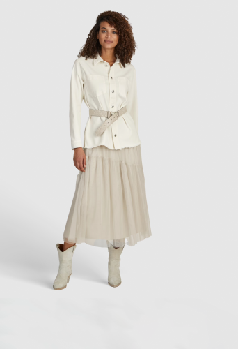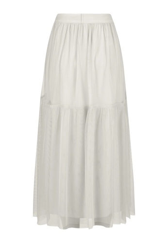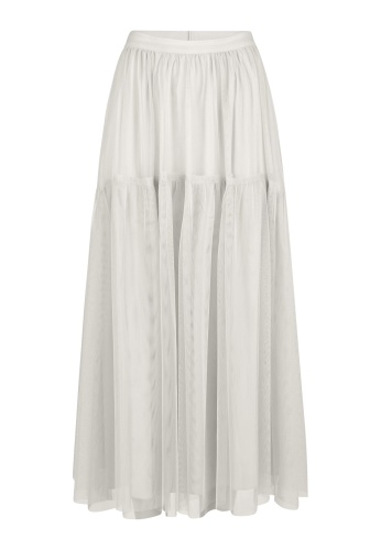 На сайте указаны российские размеры. Юбка миди изготовлена из мягкого фатина и частично многослойна. Подкладка из вискозы. Повседневная посадка поддерживается эластичным поясом.