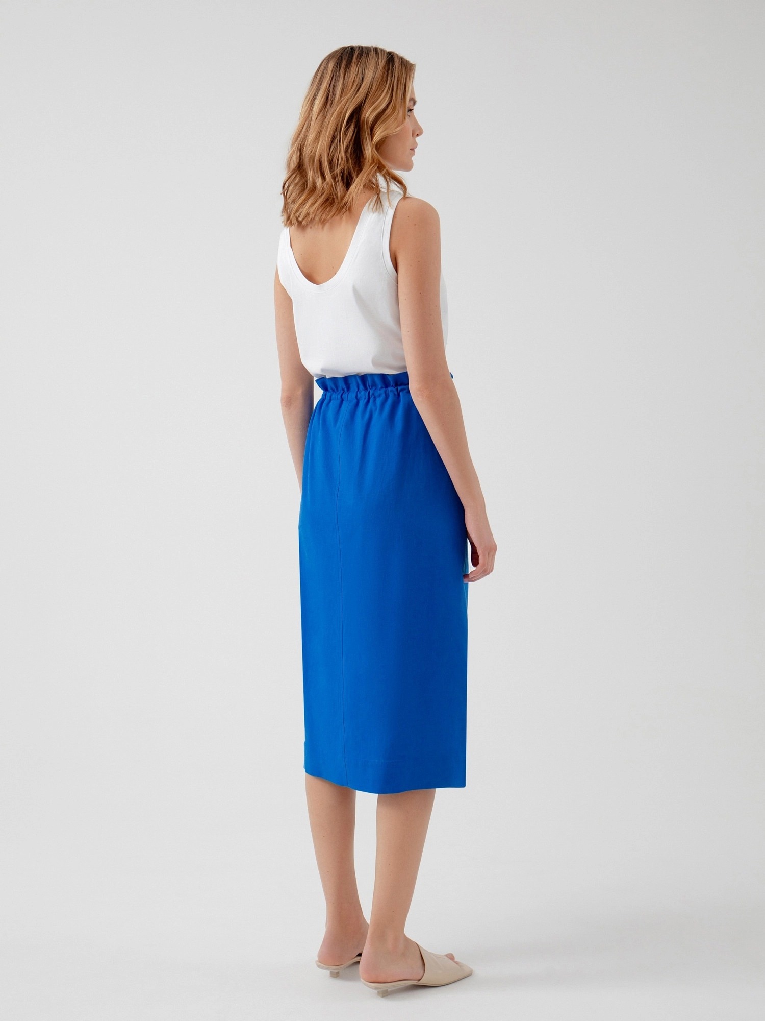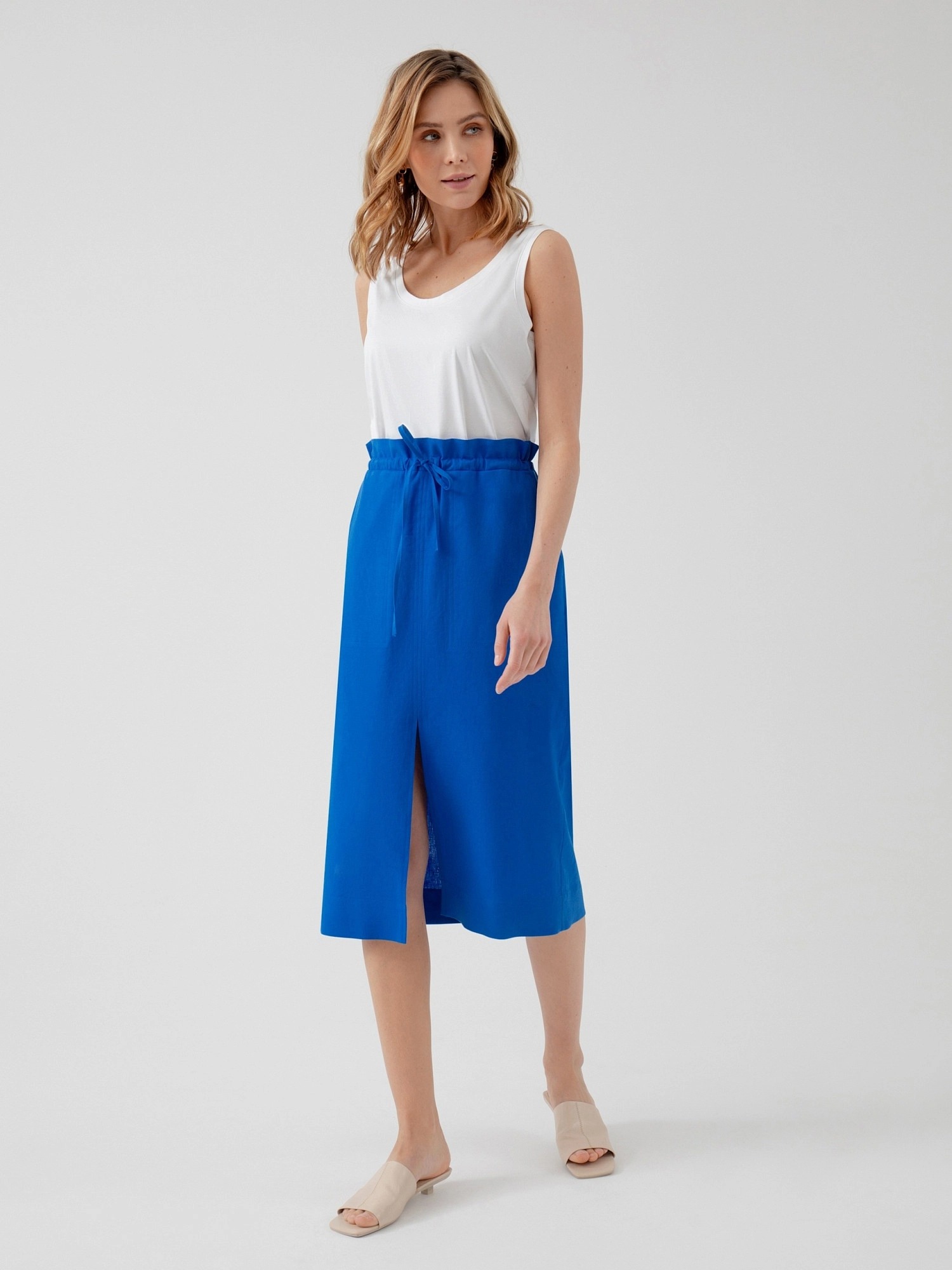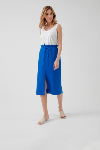 Юбка из ярко-синего хлопка, прямого силуэта, с разрезом по переду и накладными карманами. Пояс юбки на резинке с кулиской.