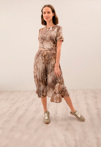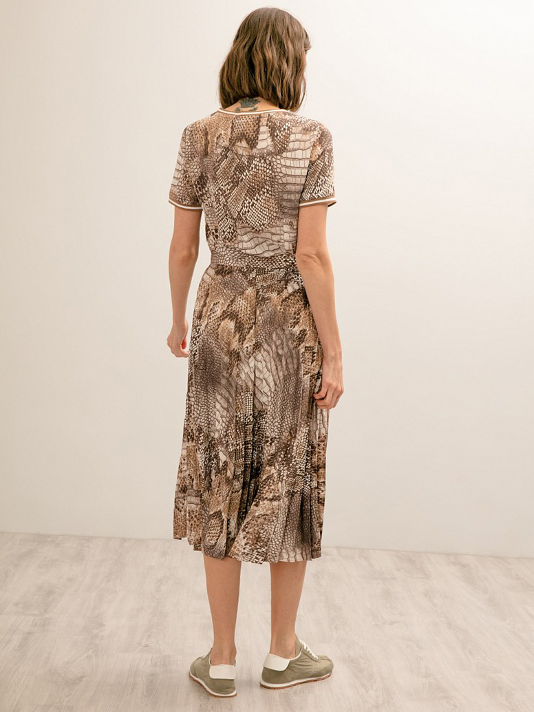 Плиссированная юбка длины миди выполнена в анималистичном узоре. Притачной пояс обеспечивает удобство ношения. Юбка отлично сочетается с футболкой или топом.