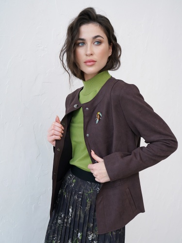 Однотонный жакет насыщенного шоколадного оттенка. Овальный вырез горловины, воротник отсутсвует. Застежка на кнопки, длинный втачной рукав, боковые прорезные карманы с листочкой.