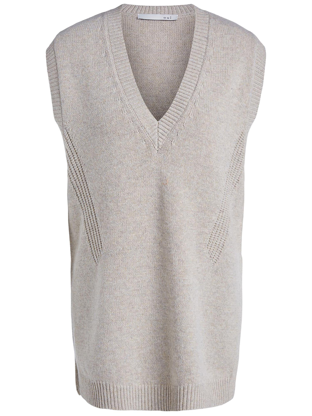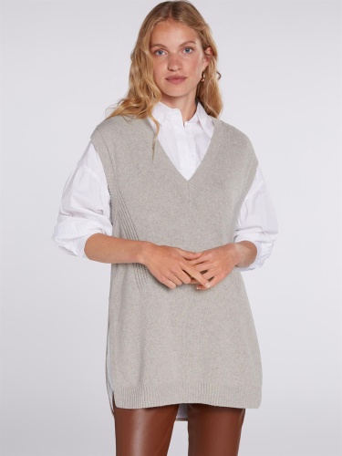Удлиненный трикотажный жилет в базовом оттенке. V-образный вырез горловины, прямой крой.
