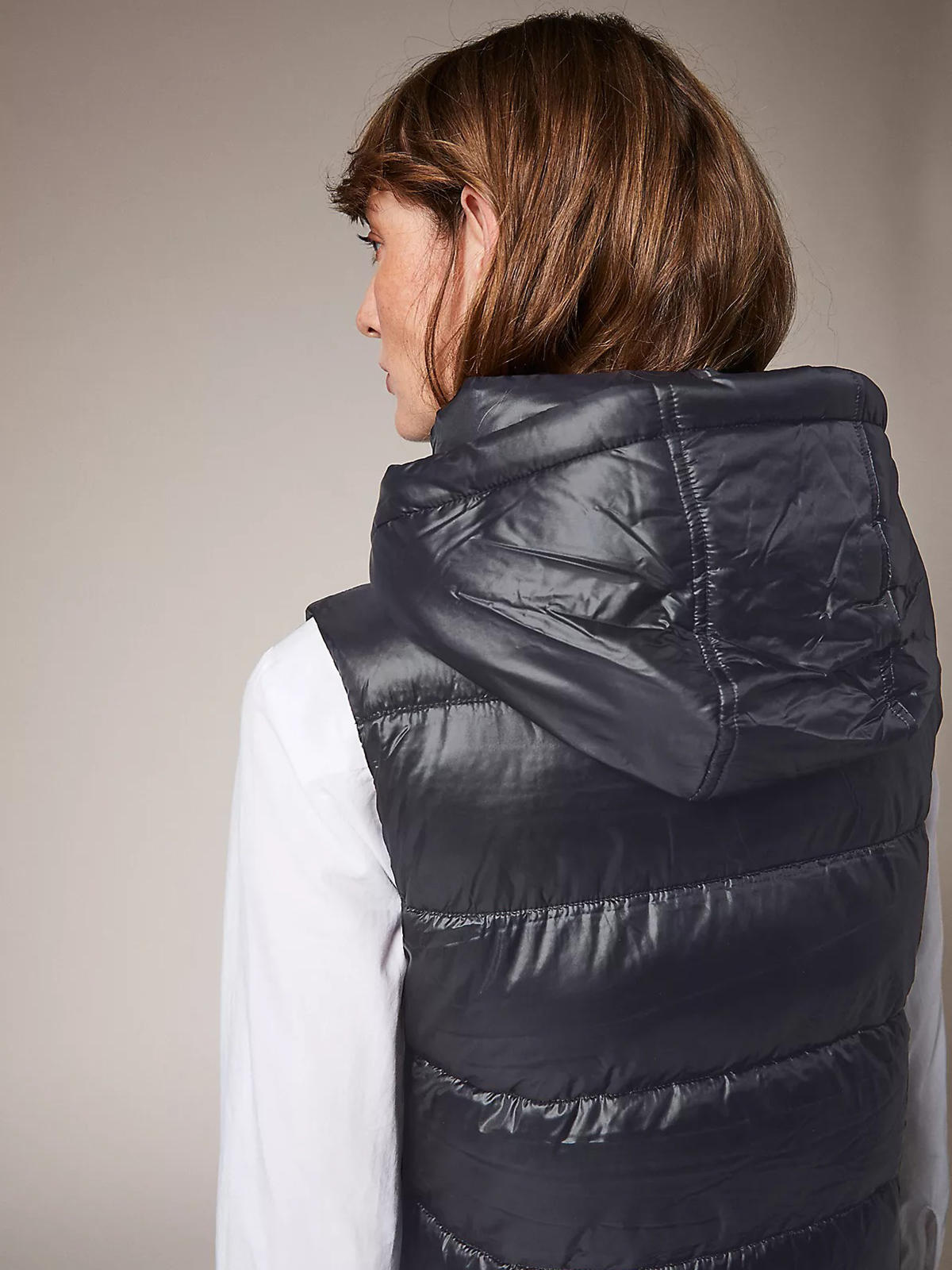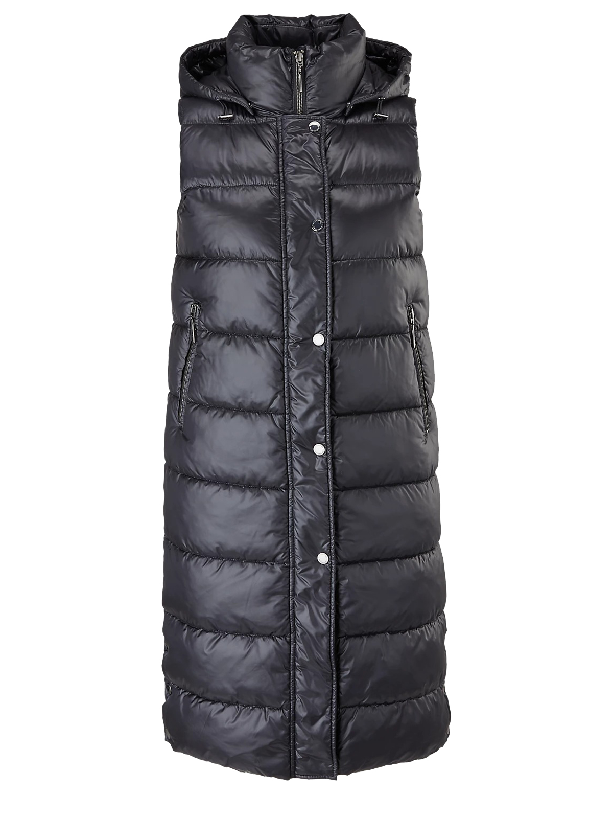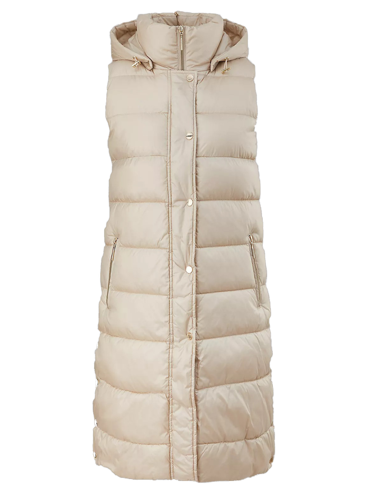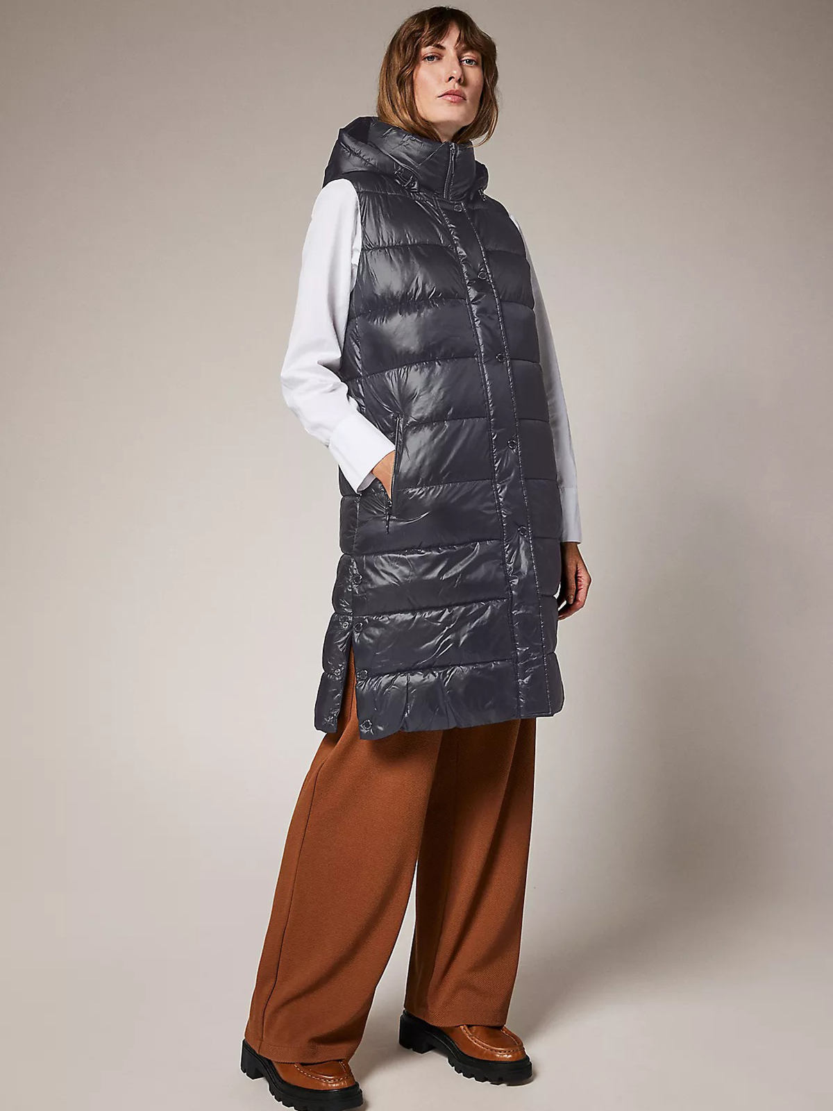 Удлиненный стеганый жилет базового оттенка – теплый и стильный элемент аутфита. Подойдет для образов в спортивном или повседневном стиле, а также для образов спорт-шик. Застежка на молнию и клепки. Объемный капюшон защищает от ветра.