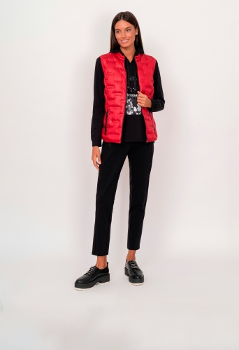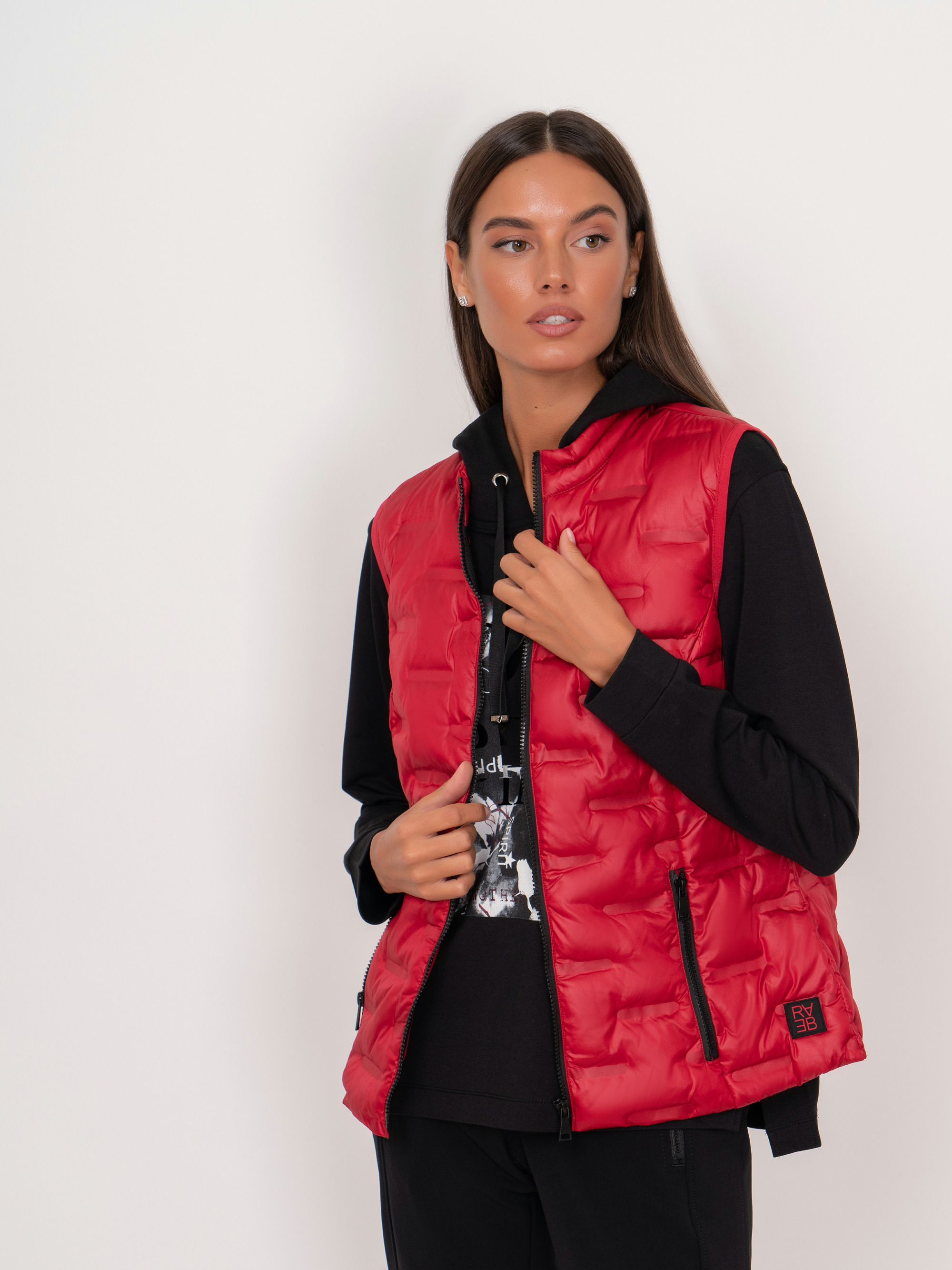 На сайте указаны российские размеры. Утепленный полуприталенный красный жилет на молнии, с воротником-стойка, с прорезными карманами. Рост модели: 175 см. Длина жилета: 62 см.
