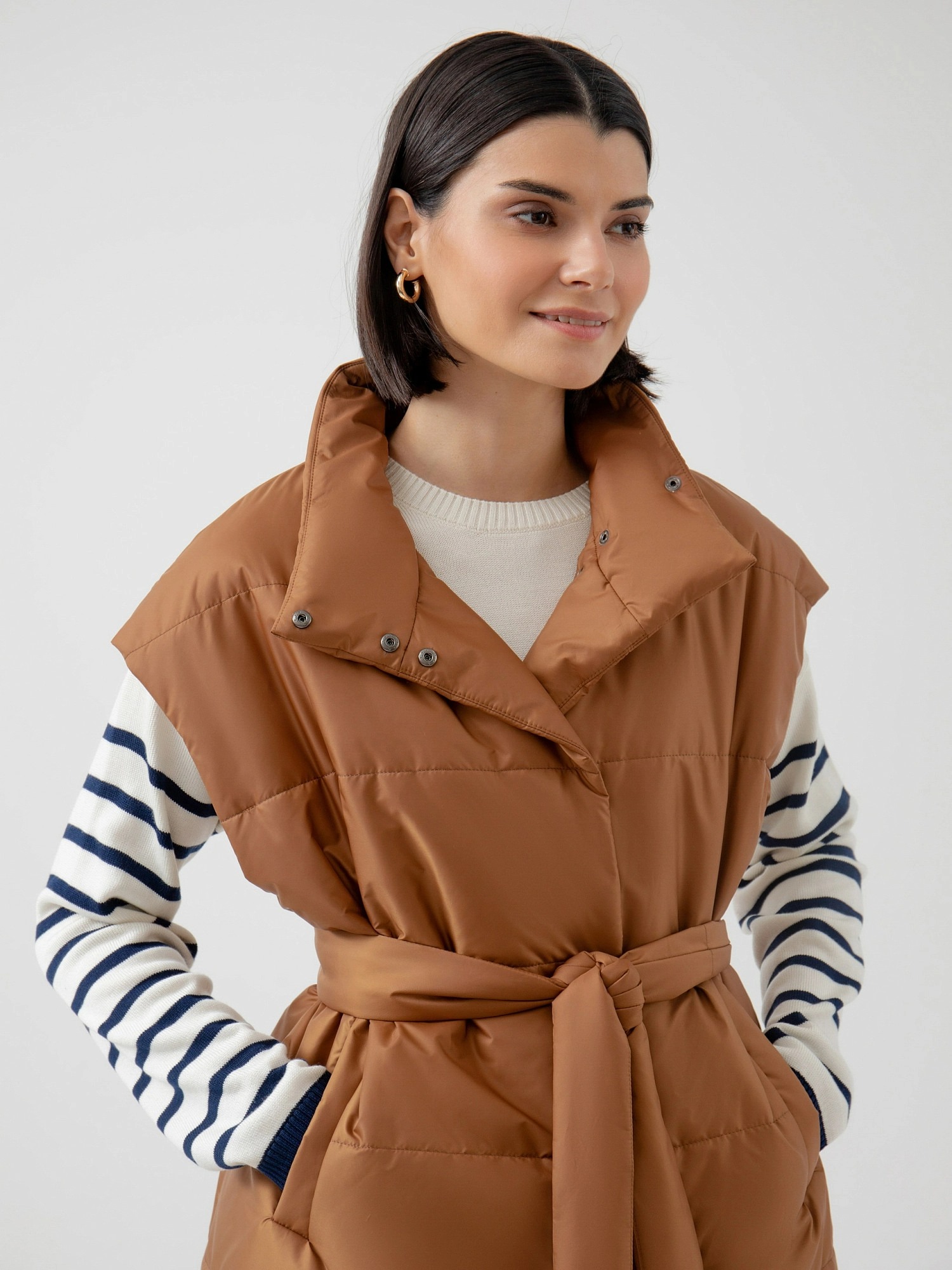 На сайте указаны российские размеры. Стеганый жилет в роскошном медовом цвете из плотной и мягкой плащевой ткани. Жилет выполнен на утеплителе, что сделает Ваш образ не только стильным, но и очень теплым. Воротник-стойка имеет комфортную посадку, которая не стеснит движений и при этом будет надежно защищать от ветра. В качестве дополнительного декоративного элемента в комплекте идет пояс, который сделает силуэт более женственным и утонченным. Для дополнительной защиты от ветра жилет выполнен с использованием мембраны RaftPro. Длина изделия 73 см. Рост модели 175 см.