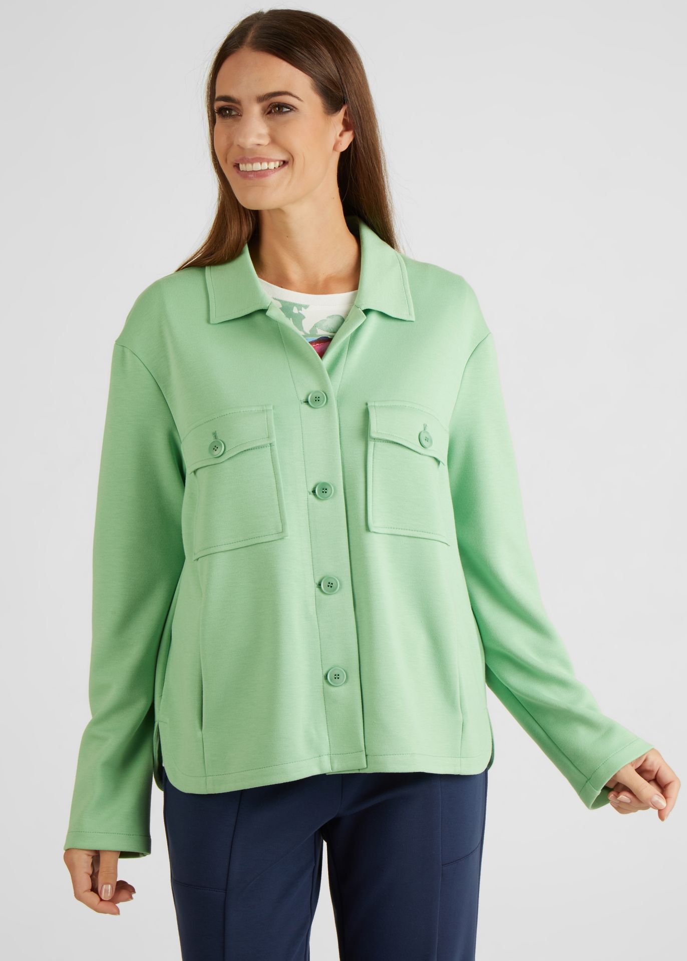 На сайте указаны российские размеры. Эта блузка-рубашка действительно привлекает внимание. Приятное, мягкое качество и широкая форма обеспечивают высокий уровень комфорта. Накладные нагрудные карманы завершают образ. Сочетайте рубашку с футболкой и джинсами. Рост модели 176 см. Длина по спинке от плеча для размера 46: 64 см.