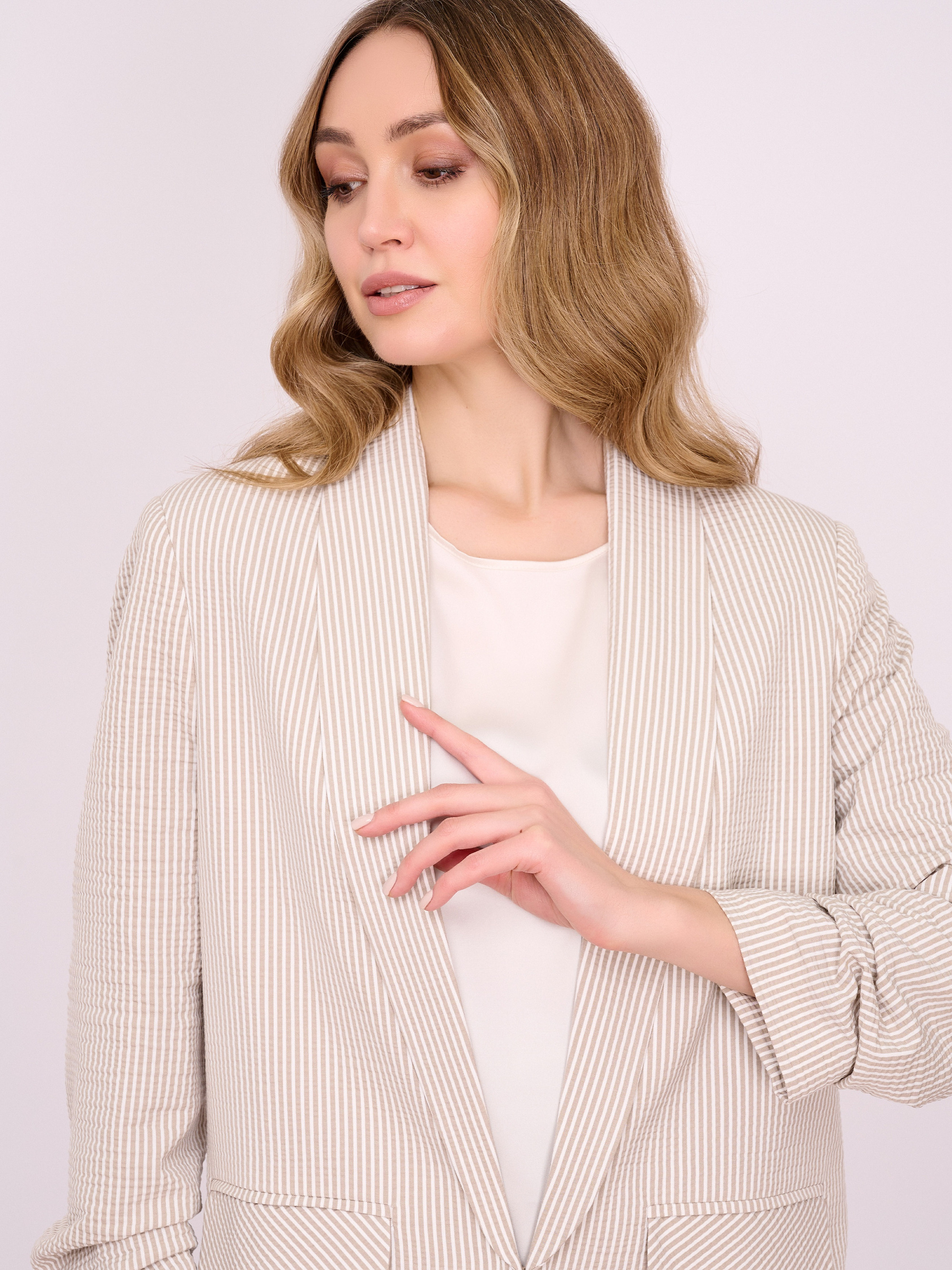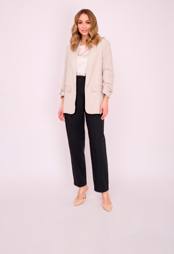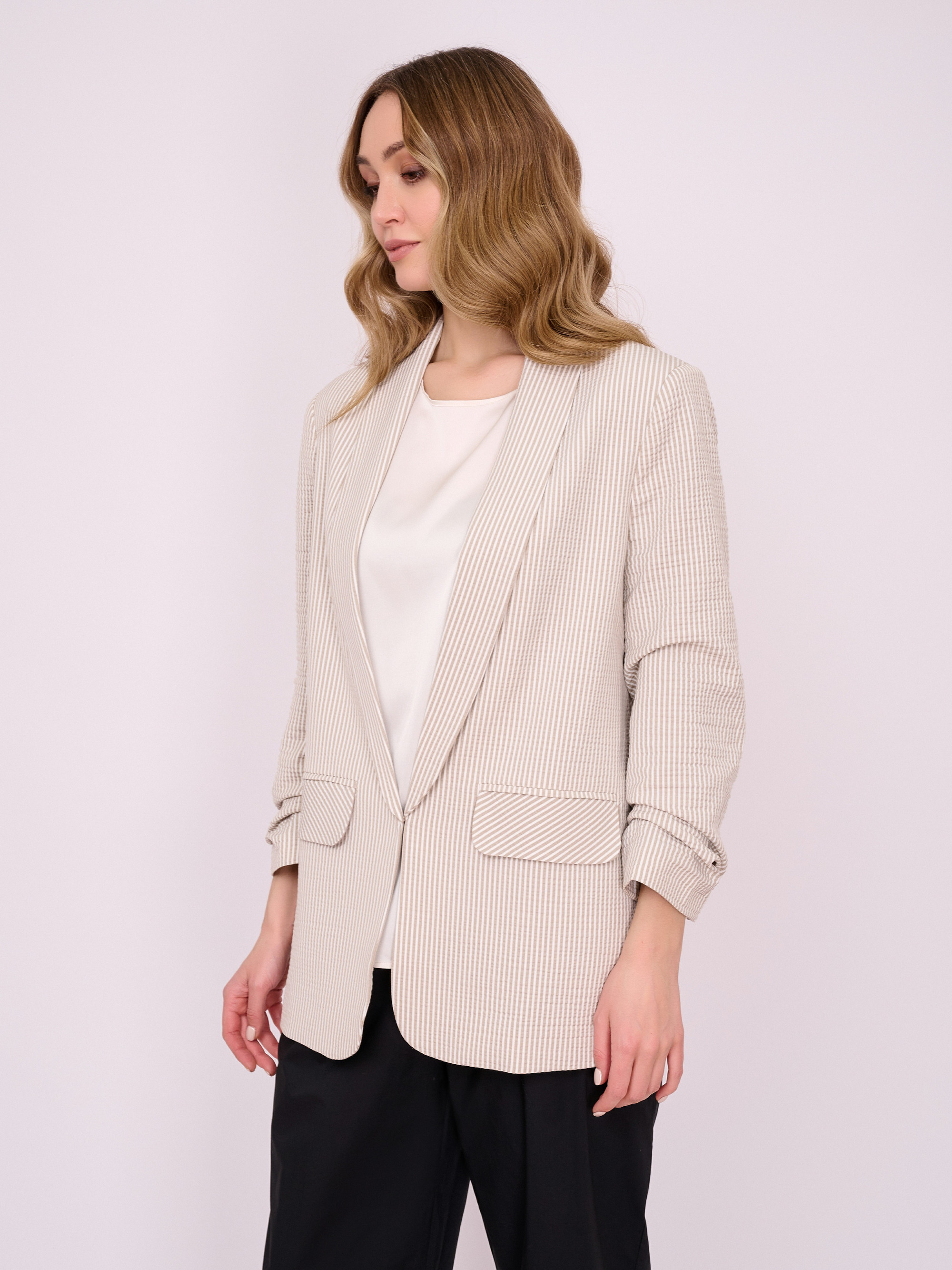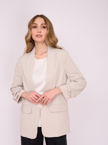На сайте указаны российские размеры. Жакет прямого покроя с рукавами 7/8, присборенными над запястьем, прорезными карманами с клапанами. Длина по спинке: 70 см. Рост модели 175 см.