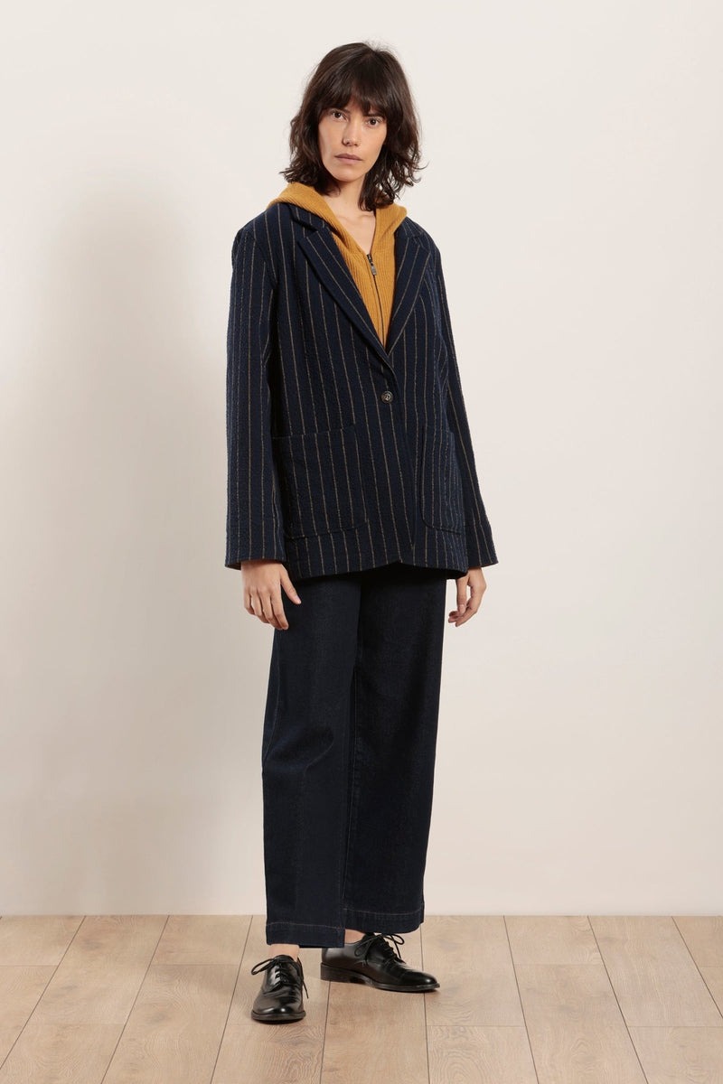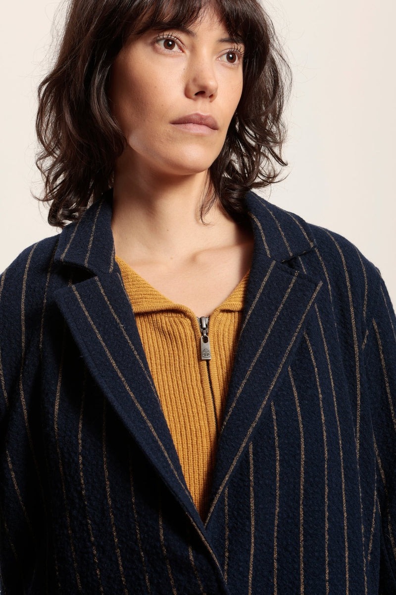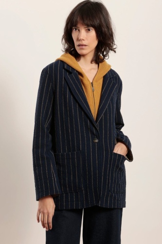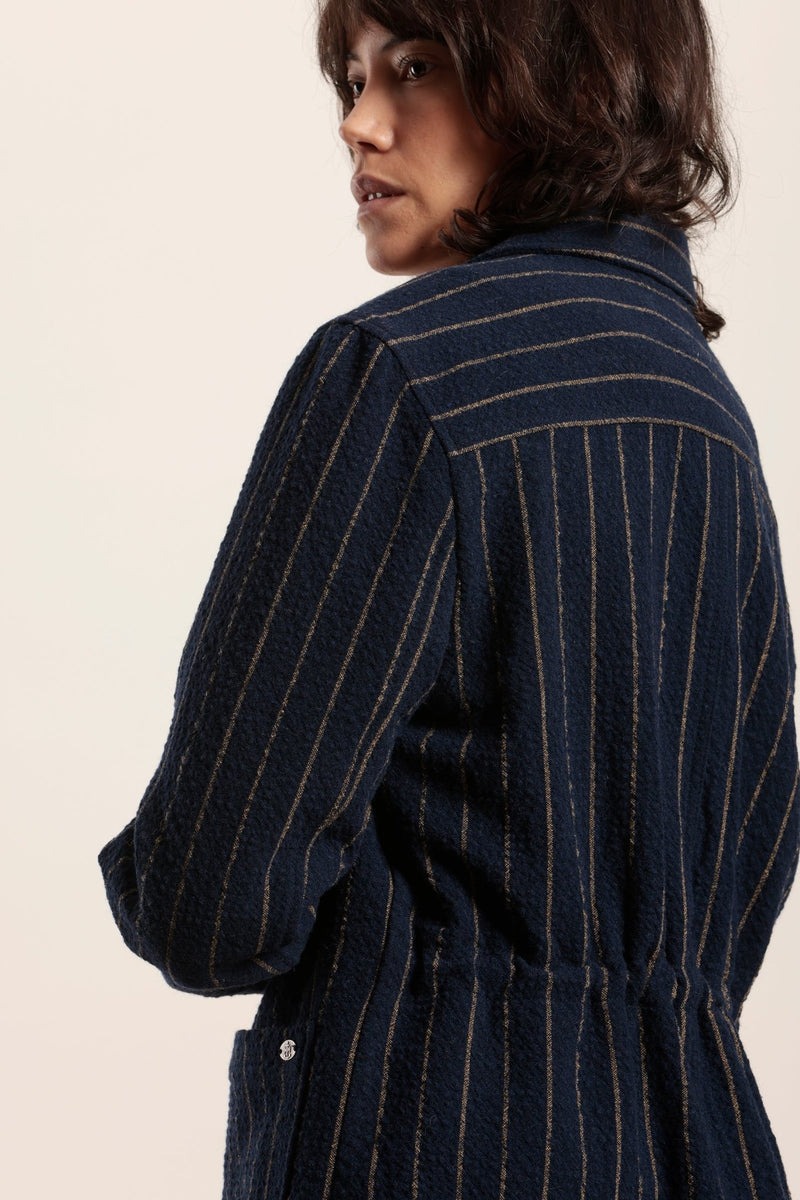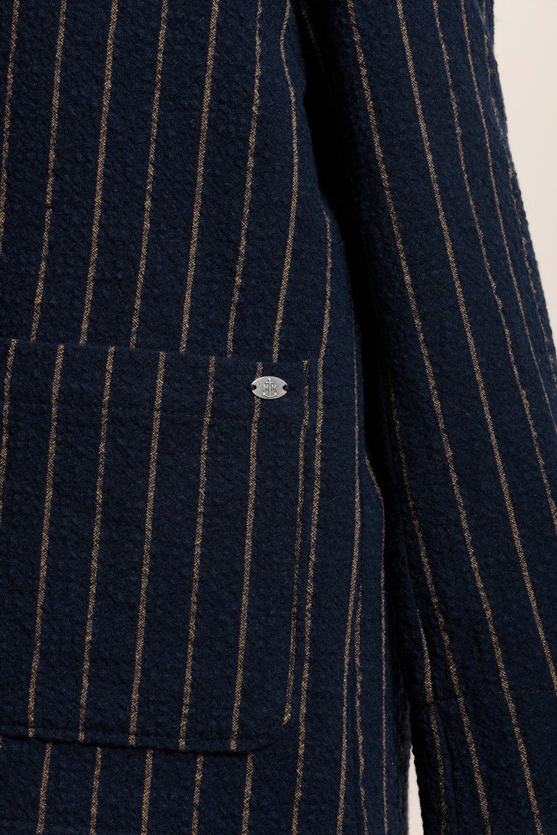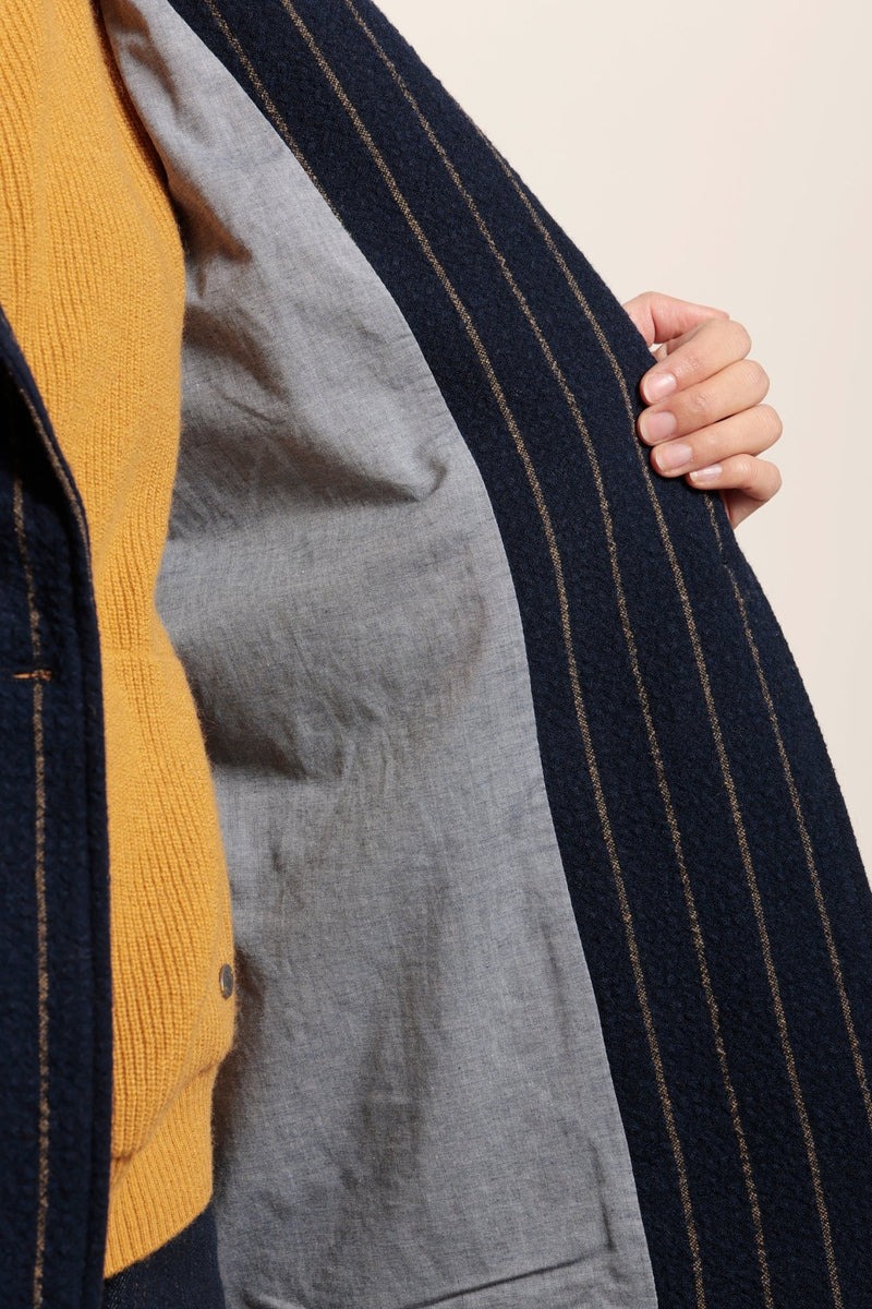 Полосатый пиджак из тонкополосной шерстяной ткани. Длинный, прямой крой. Длинные рукова. Застежка на пуговицы с роговым эффектом. 2 больших передних накладных кармана. Талия затянута шнурком в морском стиле. Тканевая подкладка. Внутренняя отделка спинки из контрастной ткани с узором в мелкую клетку.