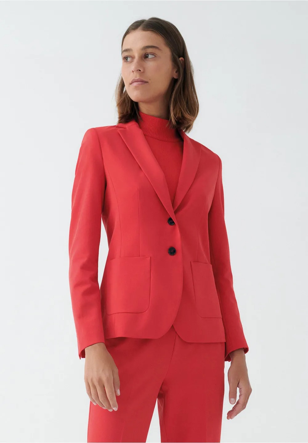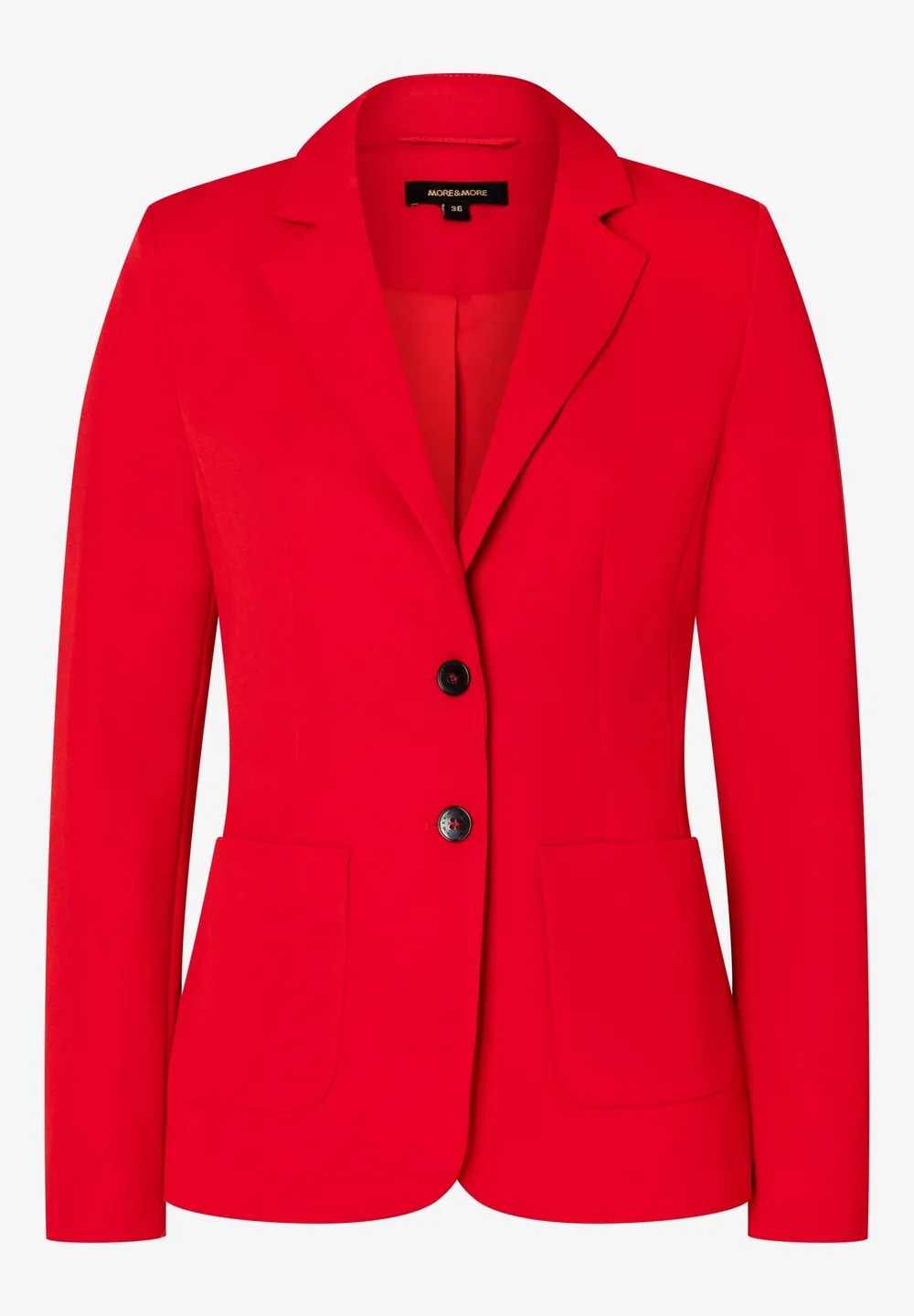 Женственный пиджак на двух пуговицах от MORE & MORE ярко-красного цвета создает современный деловой образ с соответствующими брюками. Но он также отлично сядет по фигуре в сочетании с повседневными джинсами или женственным шифоновым платьем. Воротник с лацканами, накладные карманы. Длина по размеру 42 = 62см