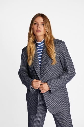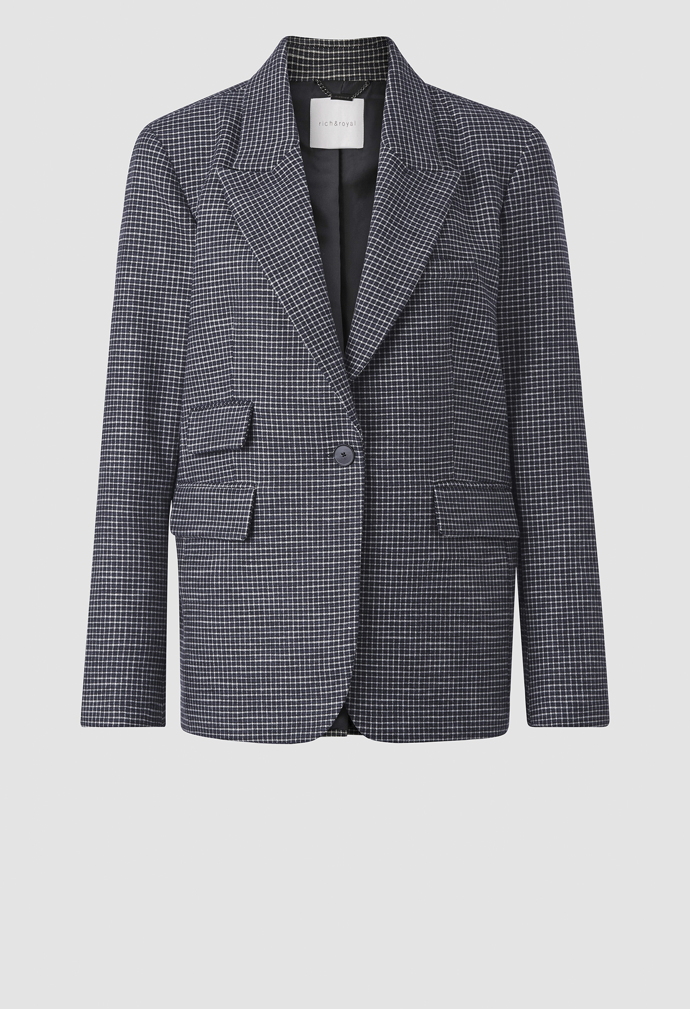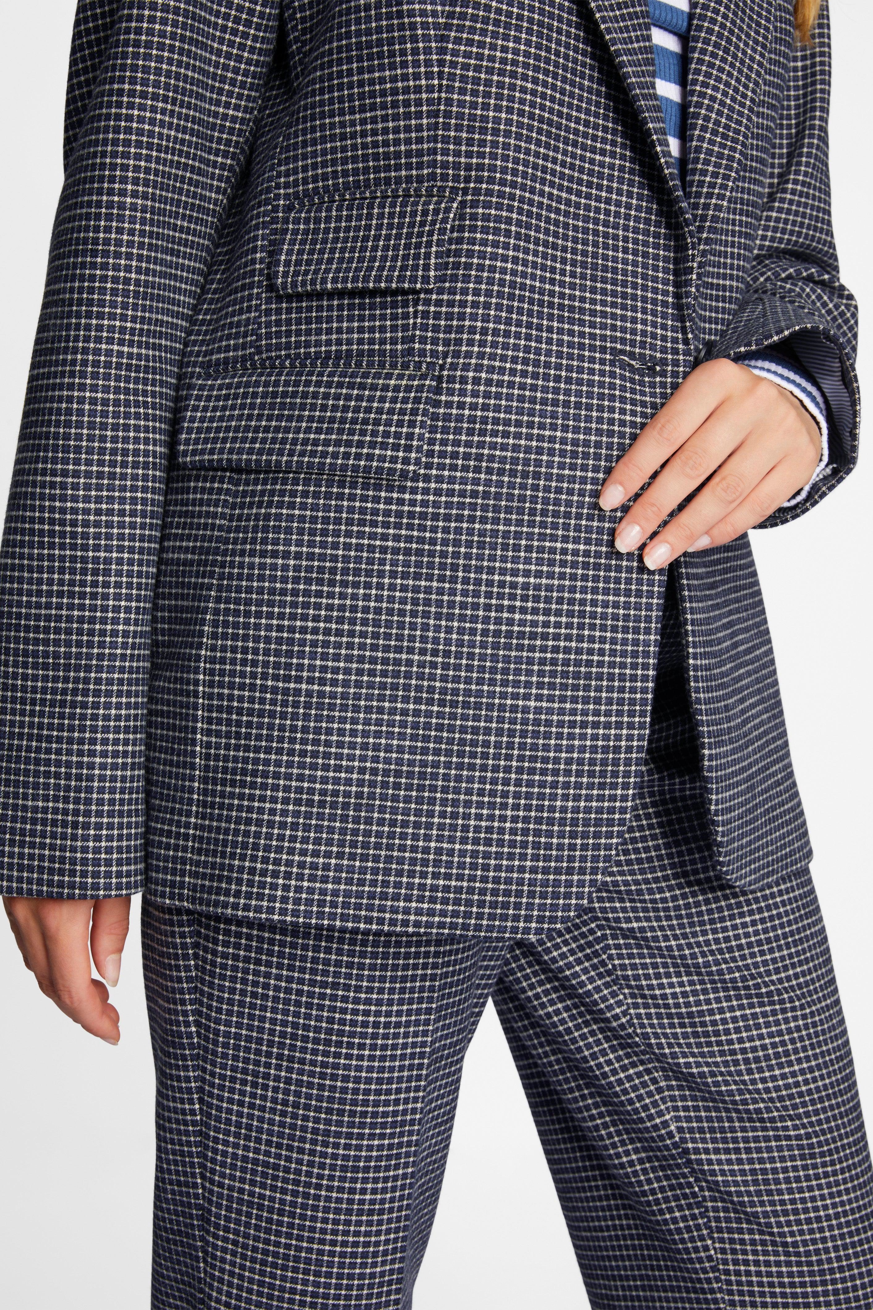 Жакет из мягкой вискозы отличается свободным кроем. Классический узор в клетку и поднимающиеся лацканы привлекают внимание. Накладной карман, карманы с клапанами и разрез сзади дополняют однобортный костюм.