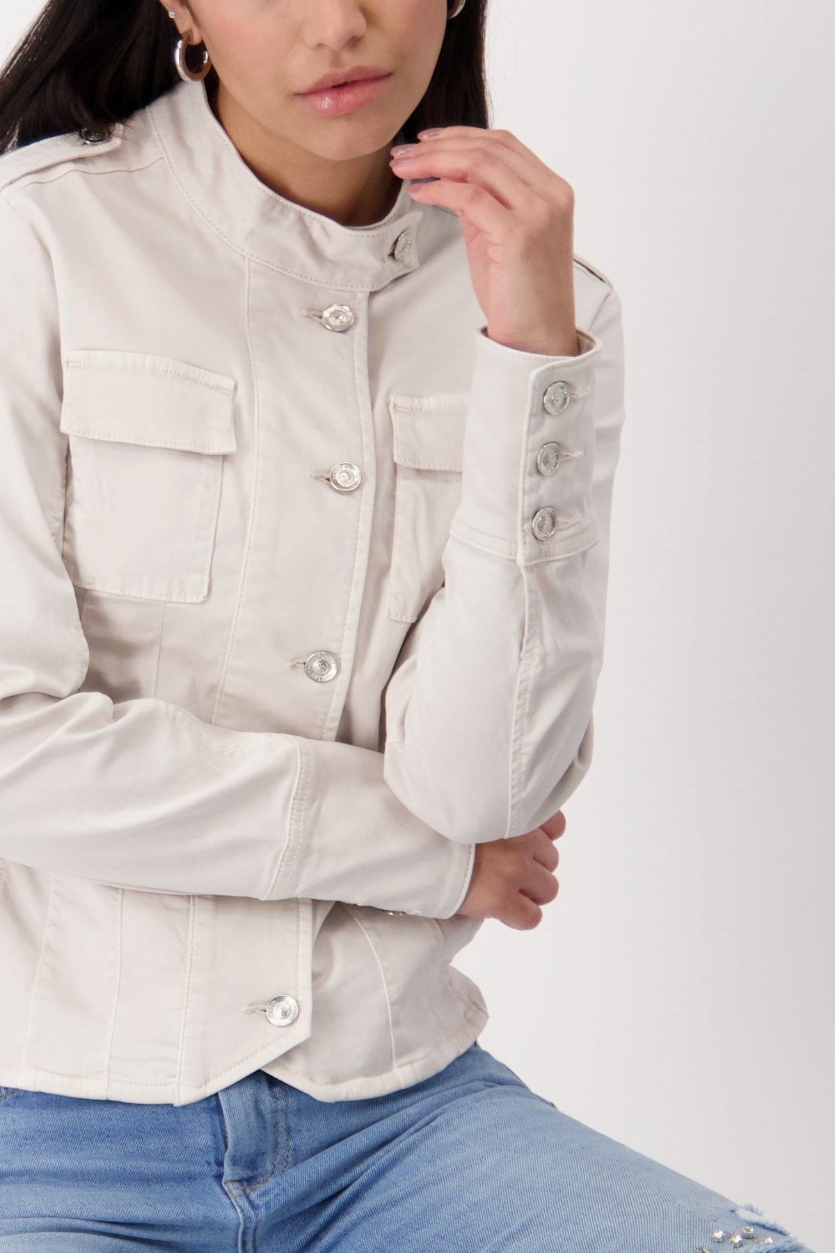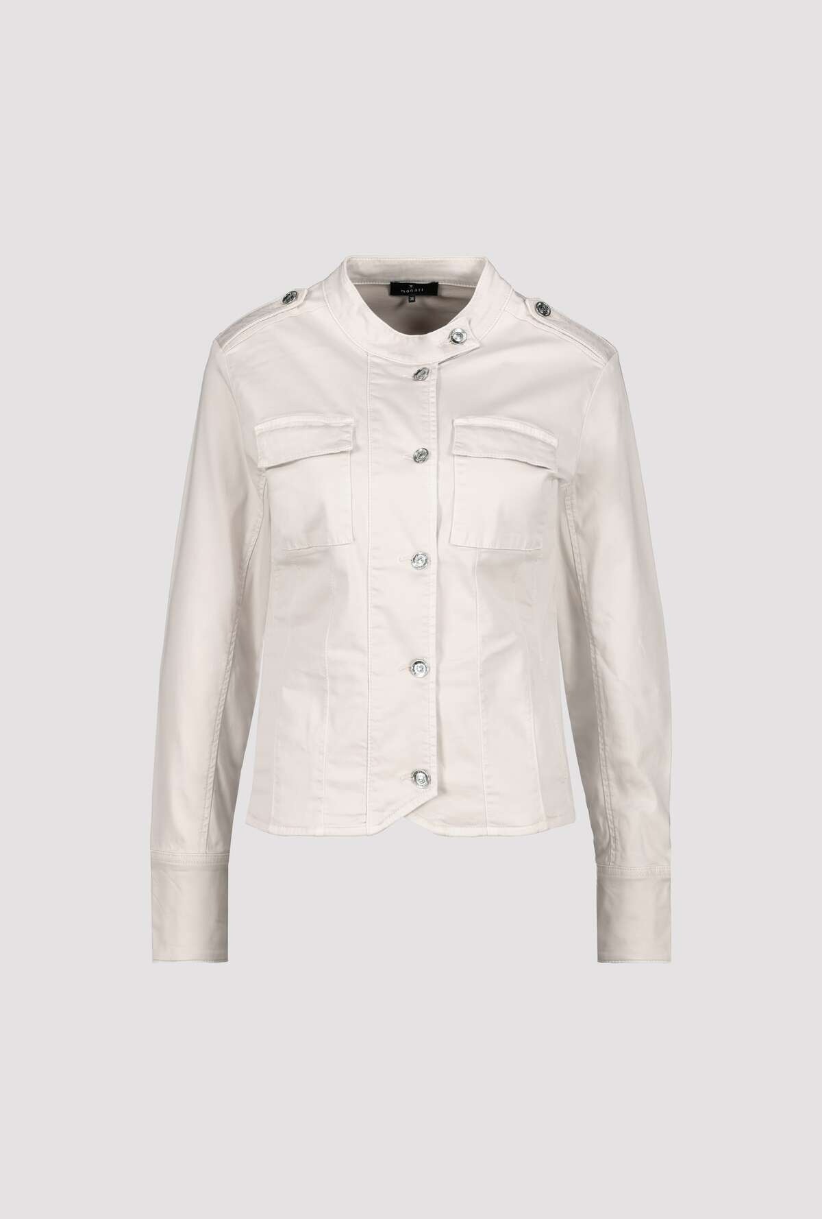 Стильная куртка из мягкого смесового лиоцелла с карманами с клапанами и бретелями, украшенная декоративной пуговицей. Эластичный материал. Регулярная посадка. Воротник-стойка и бретели с декоративными пуговицами. Длинные рукава с манжетами. Накладные карманы с клапанами на уровне груди. Удлиненная, закругленная передняя часть. Длина 44-го размера по спинке — 57 см, длина по переду — 59 см.
