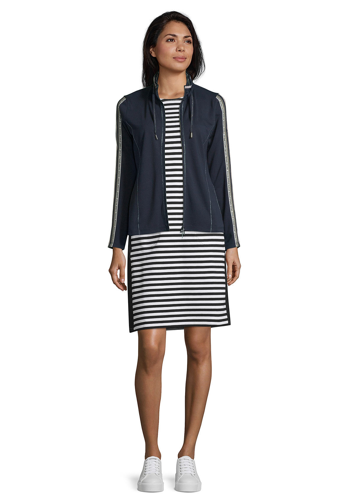 Блейзер в спортивном стиле - то, что нужно для городских прогулок. Полуприталенный силуэт, двойная застежка-молния, воротник-стойка, втачные рукава полной длины - вот что делает эту модель практичной и удобной в ношении. Отстрочка с нитью люрекса является модным акцентом и оттеняет спортивный стиль блейзера, а лампасы на рукавах вносят динамику в образ. Материал из вискозной смеси приятен к телу.