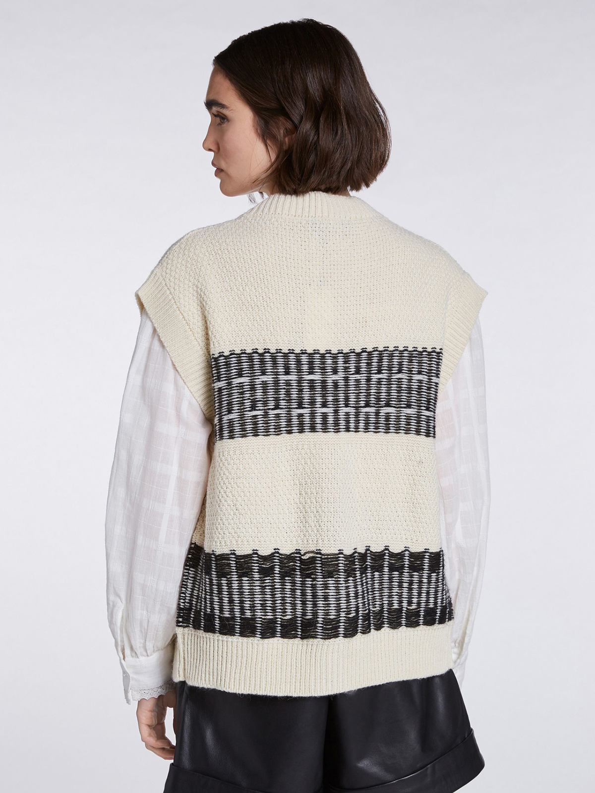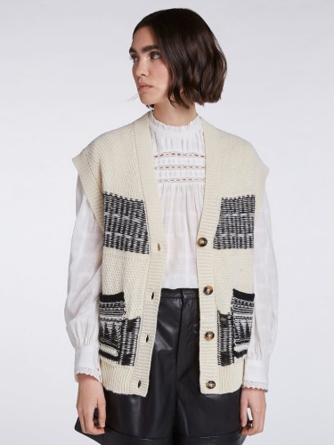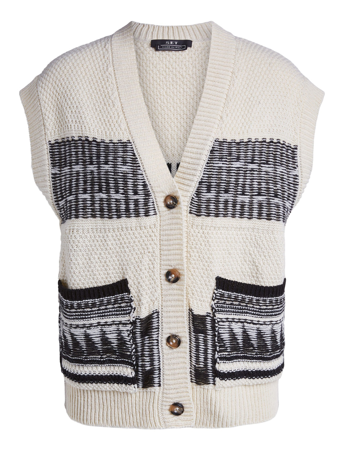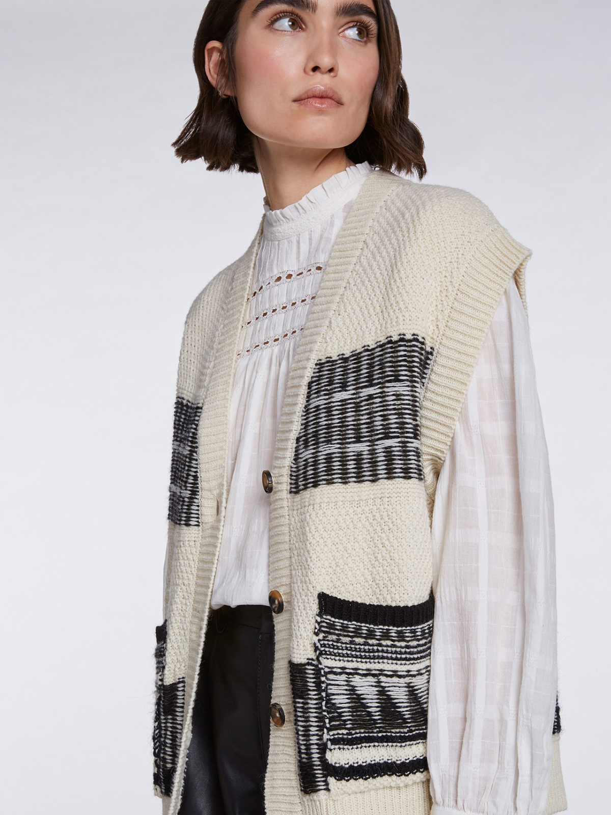 Жаккардовые жилеты – новый тренд, вошедший в моду осенью 2021. Материал из смесовой шерсти с добавлением шерсти альпаки. Накладные карманы спереди. Продуманный жаккардовый узор с лацканами. Женственный V-образный вырез с планкой на пуговицах. Длина для размера 42: 58 см.