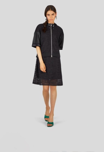 На сайте указаны Российские размеры. Жакет с короткими рукавами и капюшоном. Спереди имеются карманы. Молнии встроены в боковой шов, что позволяет варьировать ширину подола. Спину украшает благородный металлический переводной принт с логотипом Sportalm. Подол удлинен и слегка закруглен сзади.