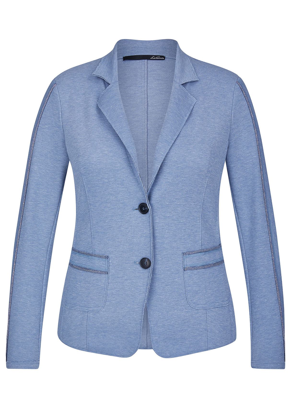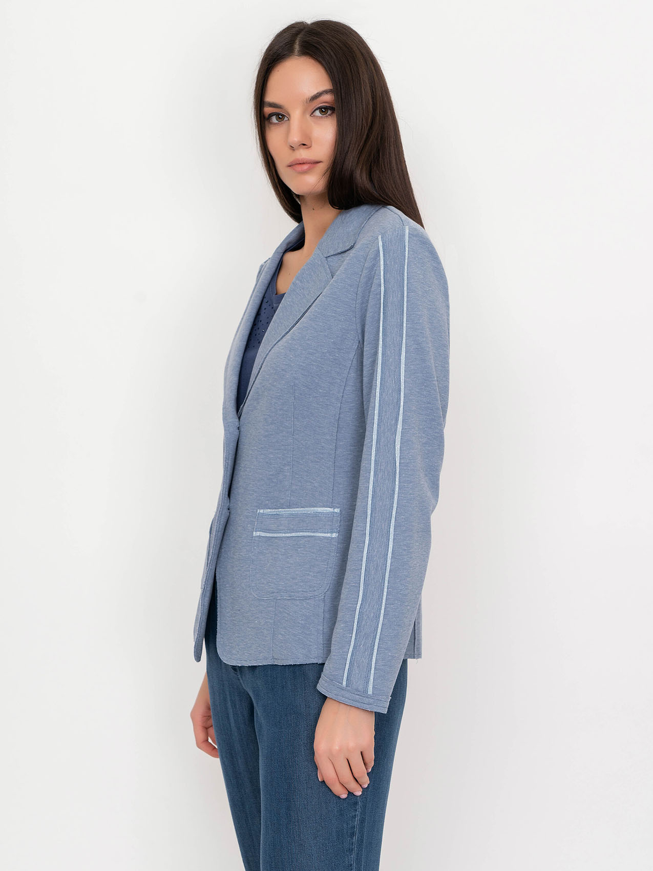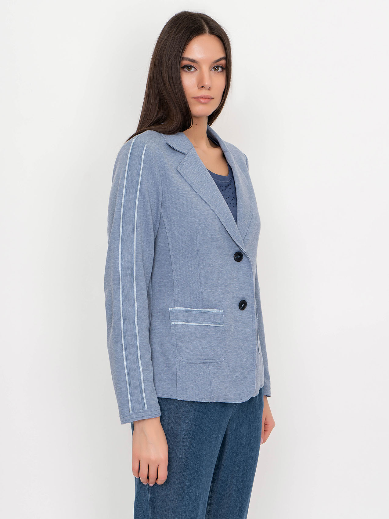 Жакет с лацканами. Застежка на пуговицах. Накладные карманы. Отделка на рукавах и карманах. Базовая модель в нейтральном цвете. Длина изделия по спинке: 60 см.