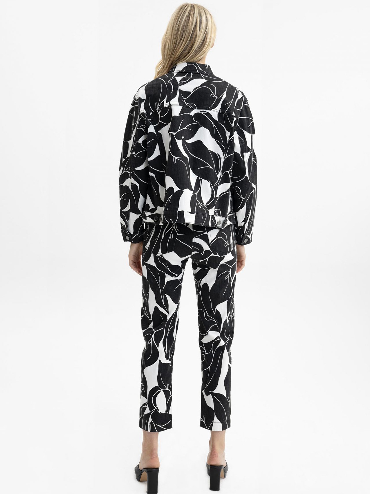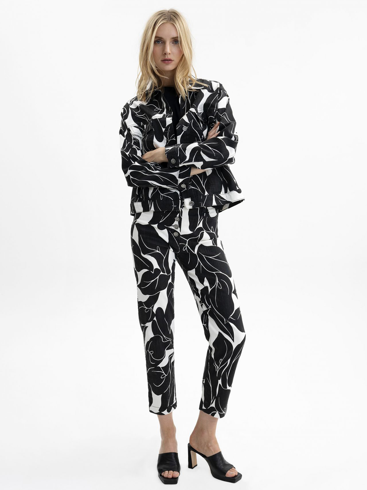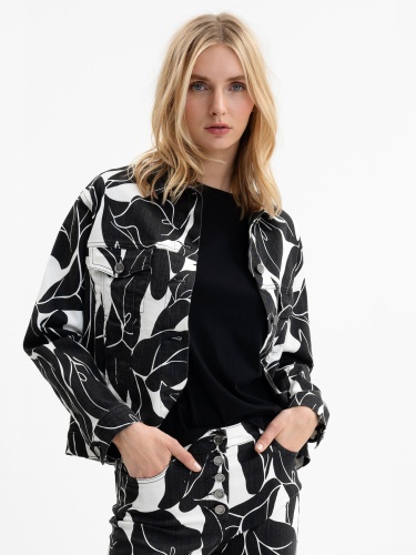 Джинсовка прямого кроя на пуговицах – всегда актуальная классика городского повседневного стиля. Контрастный тропический узор по всей поверхности изделия. Отложной рубашечный воротник, накладные карманы на груди, втачной рукав полной длины с манжетой на пуговице.