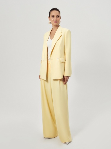 Удлиненный двубортный жакет прямого силуэта в нежно-желтом цвете из хлопковой костюмной ткани. Рукав полной длины с одной пуговицей на шлице. Прорезной карман с клапаном. Жакет на подкладке.