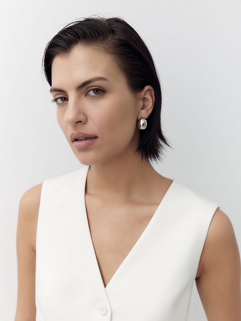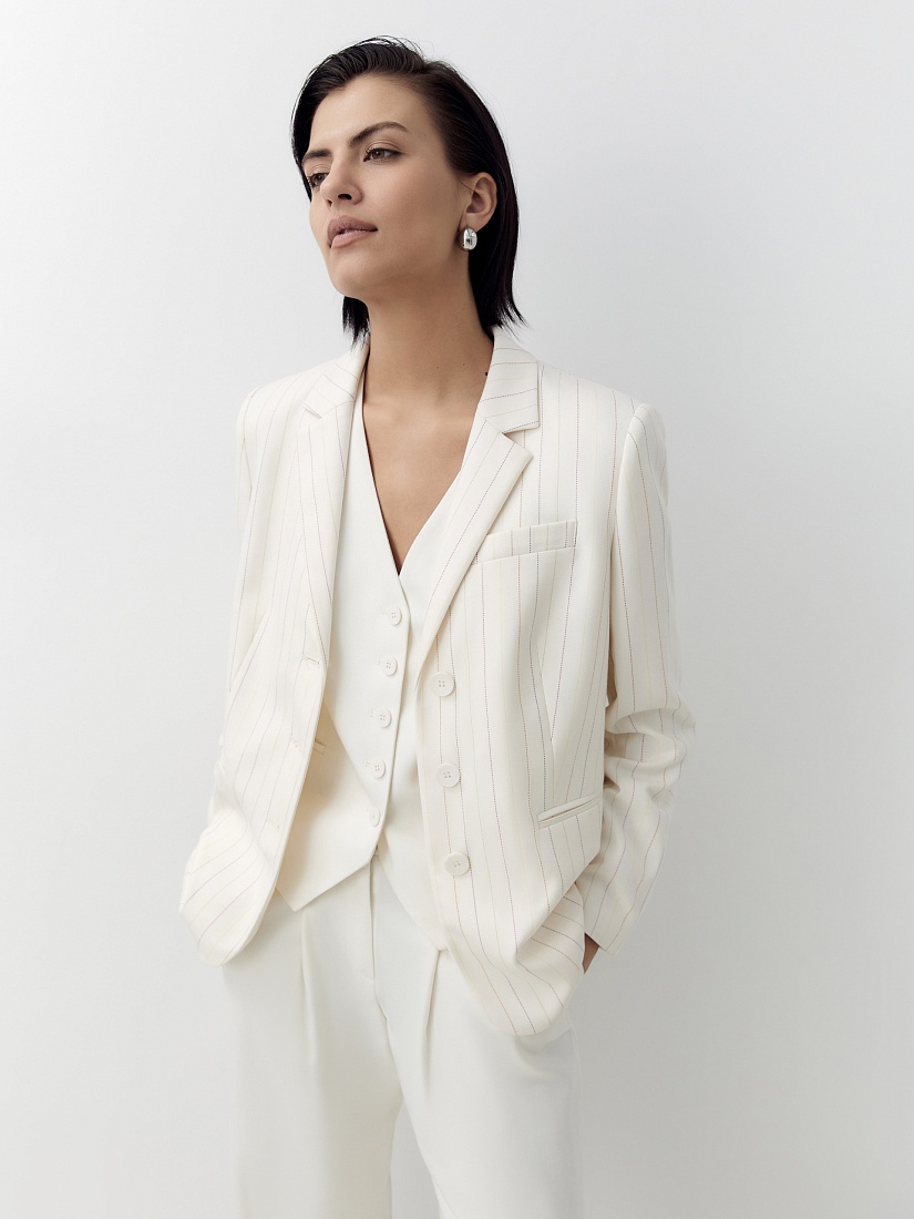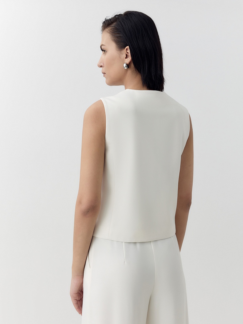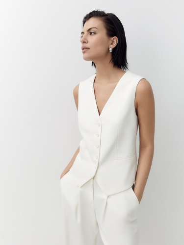 Прямой жилет с V-образным вырезом и листочками. Жилет выполнен из костюмной ткани молочного цвета.