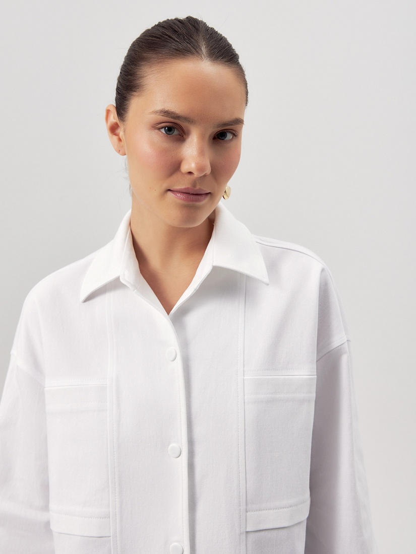 Жакет прямого силуэта с классическим отложным воротником, спущенным плечом и рукавом полной длины на манжете. Застежка спереди на кнопки в цвет ткани. Спереди рельефы и накладные карманы. Идеальный вариант для прохладной погоды. А белый цвет идеально сочетается с большим количеством повседневной одежды разных стилей.
